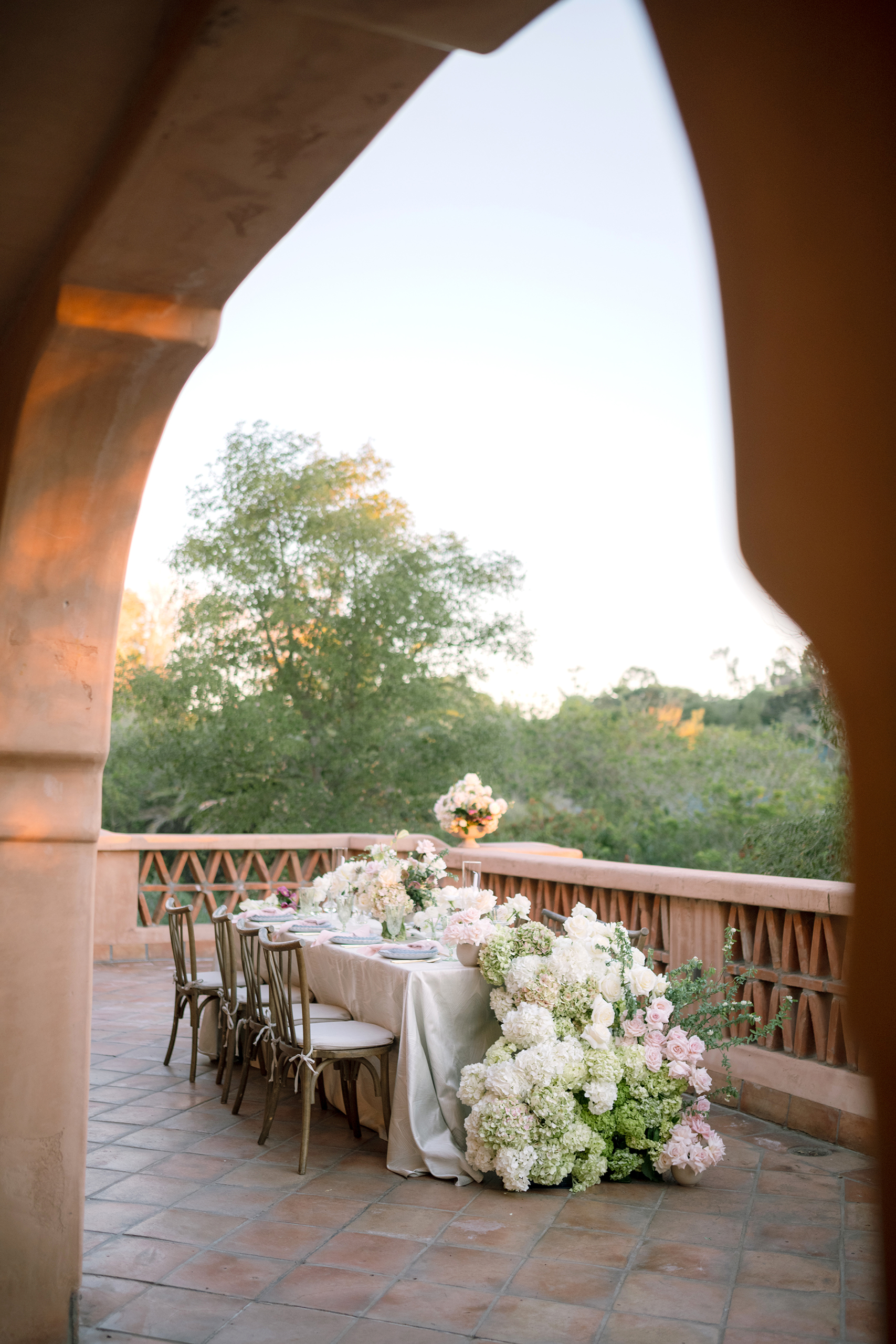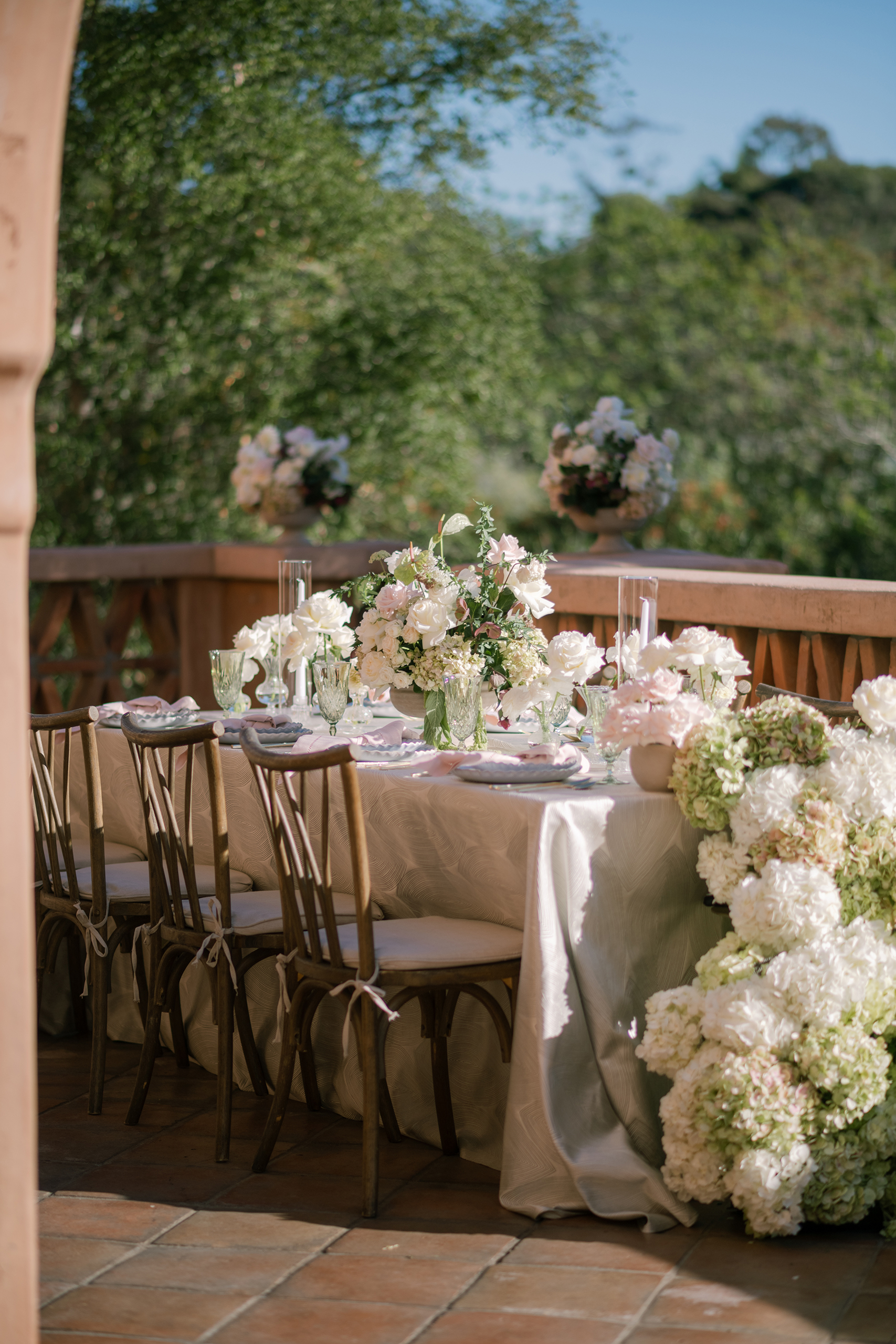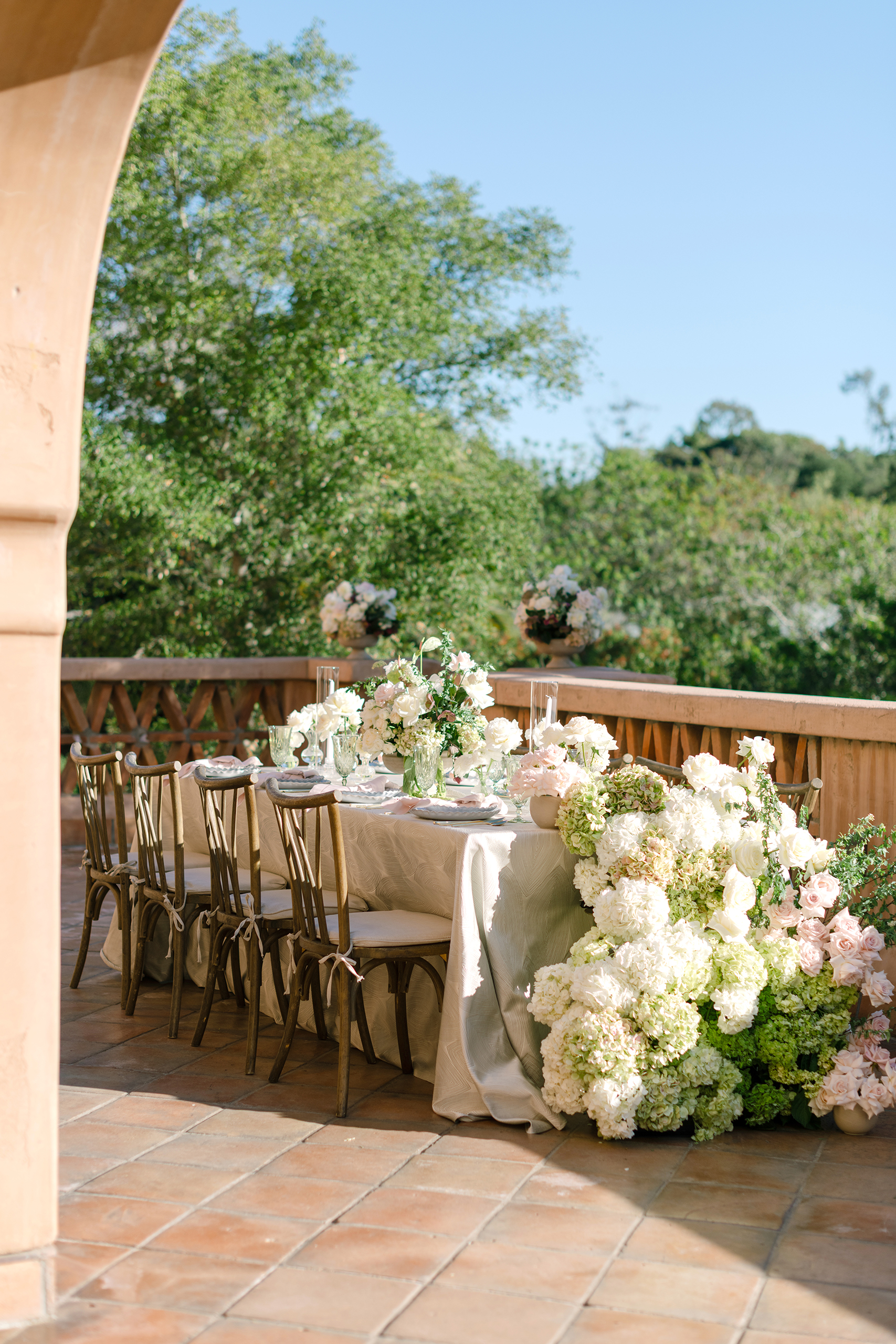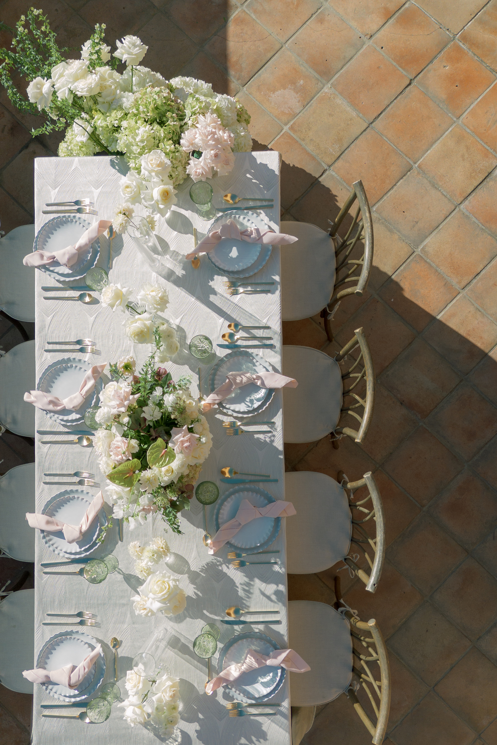 The lush, romantic Mediterranean-inspired Rancho Valencia Resort & Spa in Rancho Santa Fe served as the backdrop for this themed shoot designed to feel “elegant and timeless,” according to Nicole Shadoan of Wedding Agency San Diego. With florist Inna Judelson of Love Zen Floral at the helm, a soft, modern vision of California luxury took shape, and Judelson’s head-turning arrangements were at the heart. According to Shadoan, the focal point of the tablescape was the cascading florals. Since flowers are typically the first thing guests see at a wedding, that first impression was key. Judelson wanted the florals to flow seamlessly with the bride’s classic, glamorous style, meant to “stay in your mind, like a fairy-tale love story forever.” She chose flowers that were “simultaneously elegant, timeless, and modern,” mixing Quicksand roses, antique and white hydrangeas, and dahlias, with touches of anthurium, Japanese sweet peas, hellebores, and calla lilies. “I also used Amaranthus to create a dramatic, romantic vibe,” Judelson explained. Shadoan elevated the tablescape with subtle pops of color, textured linen, green glassware, and blush napkins, giving the shoot that “extra luxurious feel.”
