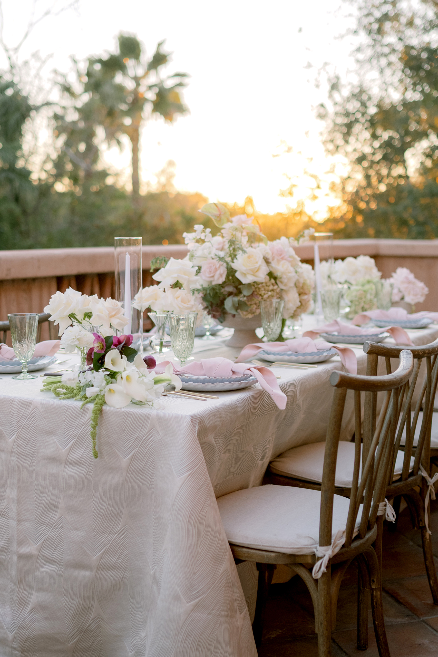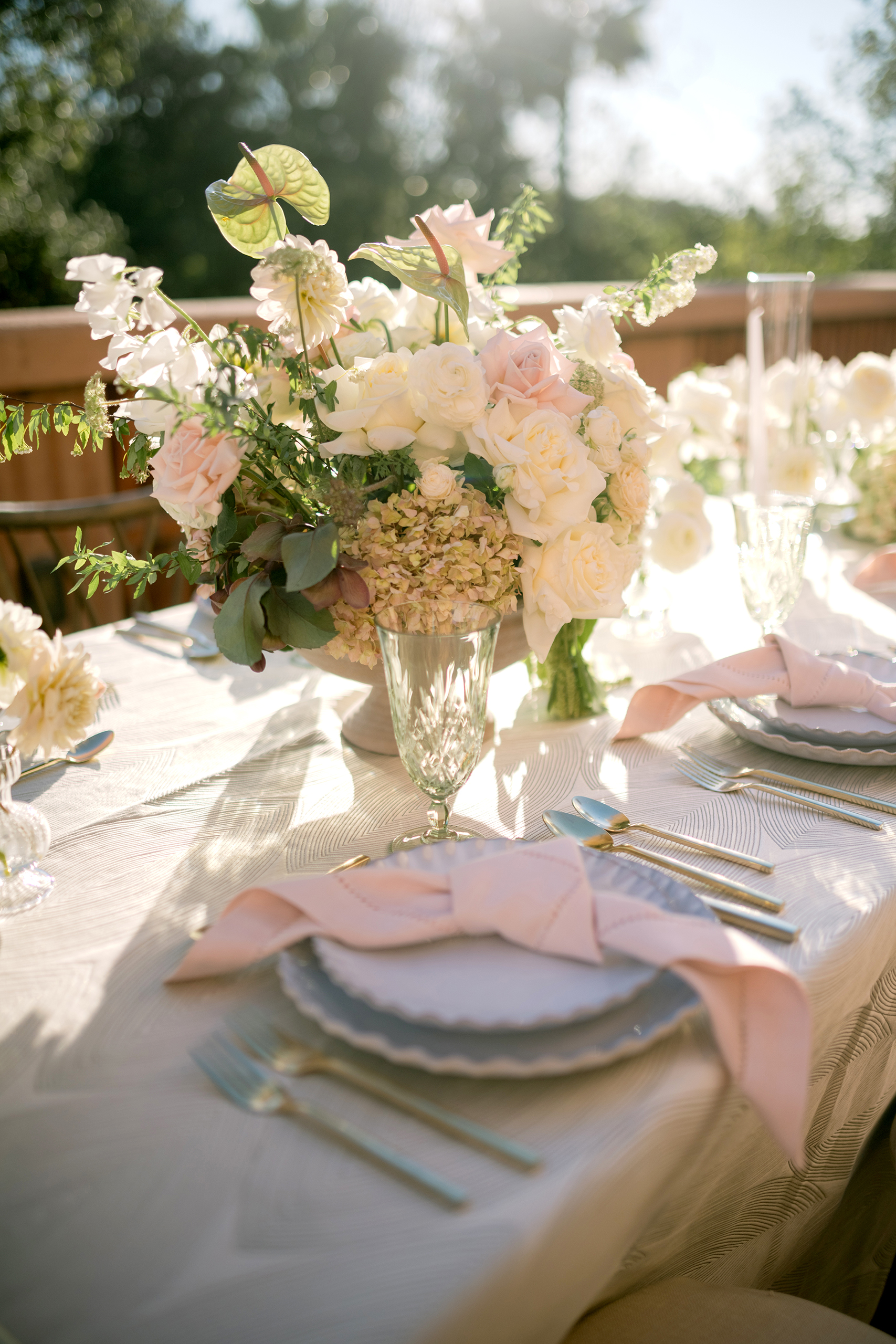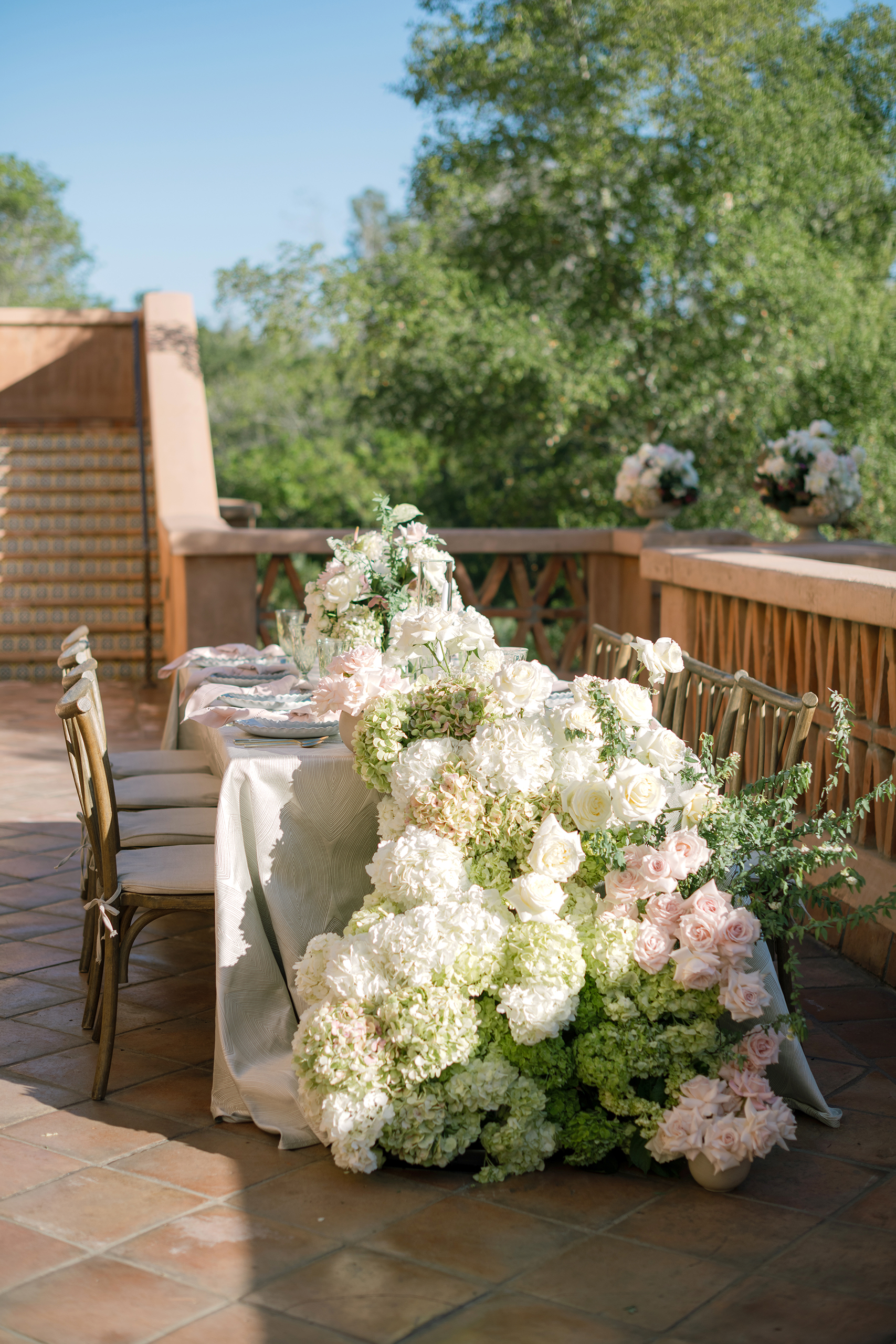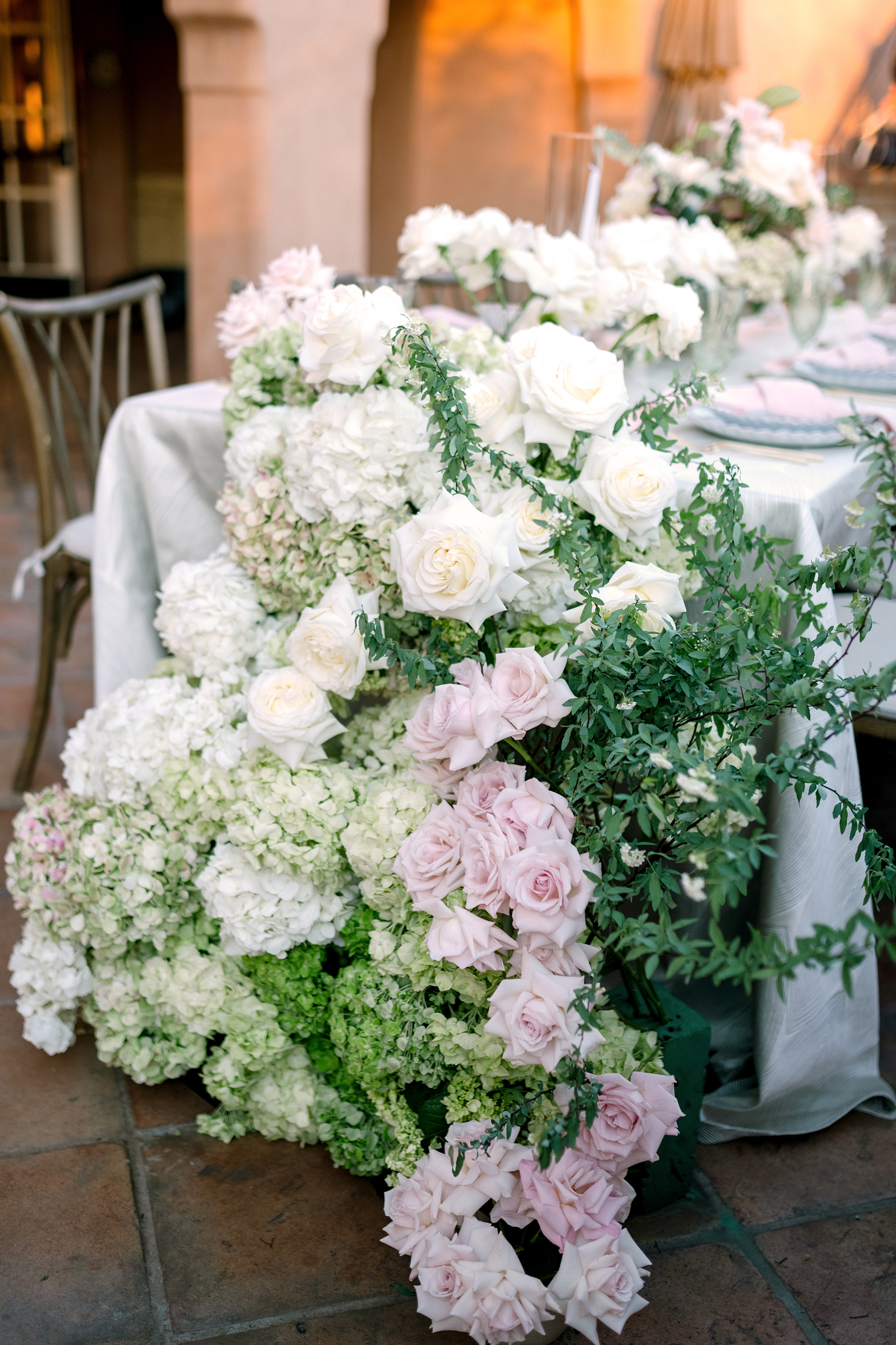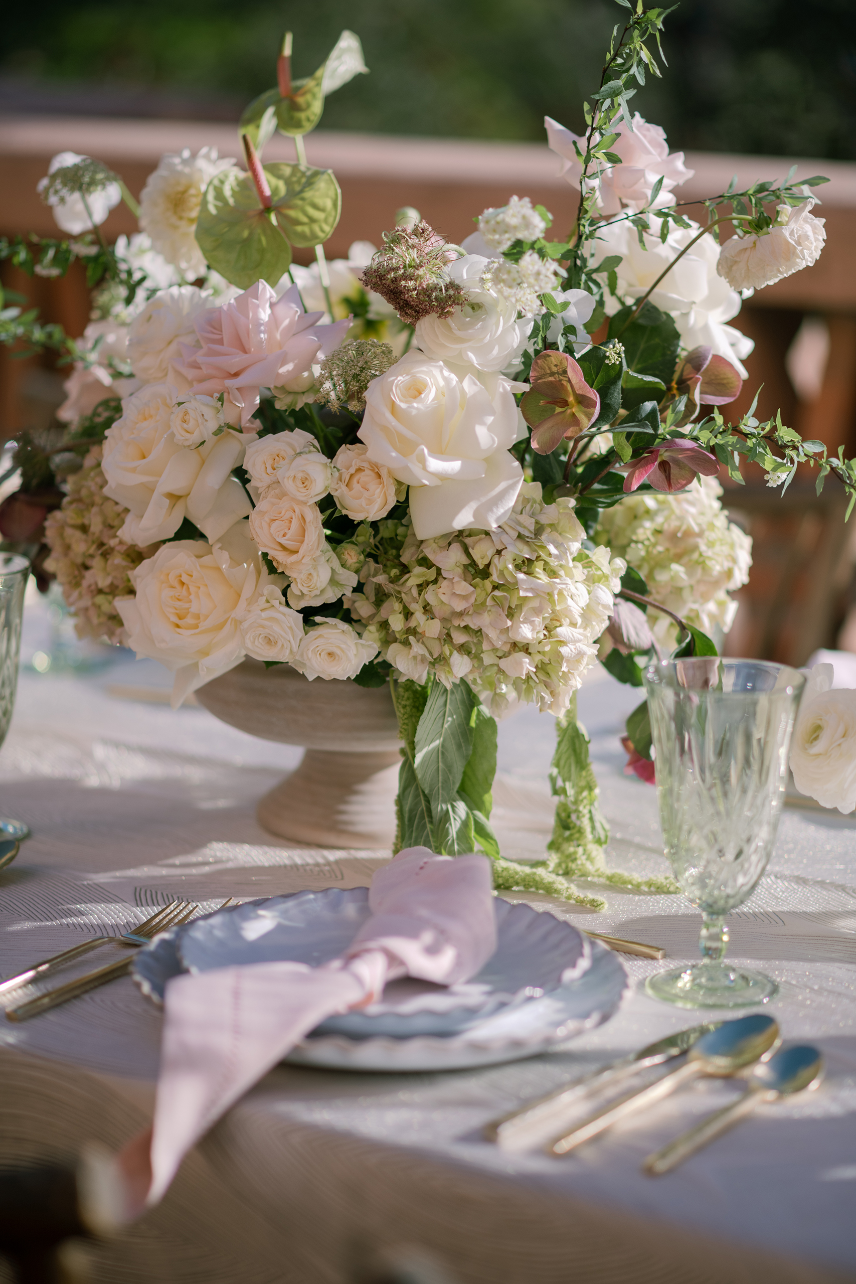 The lush, romantic Mediterranean-inspired Rancho Valencia Resort & Spa in Rancho Santa Fe served as the backdrop for this themed shoot designed to feel “elegant and timeless,” according to Nicole Shadoan of Wedding Agency San Diego. With florist Inna Judelson of Love Zen Floral at the helm, a soft, modern vision of California luxury took shape, and Judelson’s head-turning arrangements were at the heart. According to Shadoan, the focal point of the tablescape was the cascading florals. Since flowers are typically the first thing guests see at a wedding, that first impression was key. Judelson wanted the florals to flow seamlessly with the bride’s classic, glamorous style, meant to “stay in your mind, like a fairy-tale love story forever.” She chose flowers that were “simultaneously elegant, timeless, and modern,” mixing Quicksand roses, antique and white hydrangeas, and dahlias, with touches of anthurium, Japanese sweet peas, hellebores, and calla lilies. “I also used Amaranthus to create a dramatic, romantic vibe,” Judelson explained. Shadoan elevated the tablescape with subtle pops of color, textured linen, green glassware, and blush napkins, giving the shoot that “extra luxurious feel.”