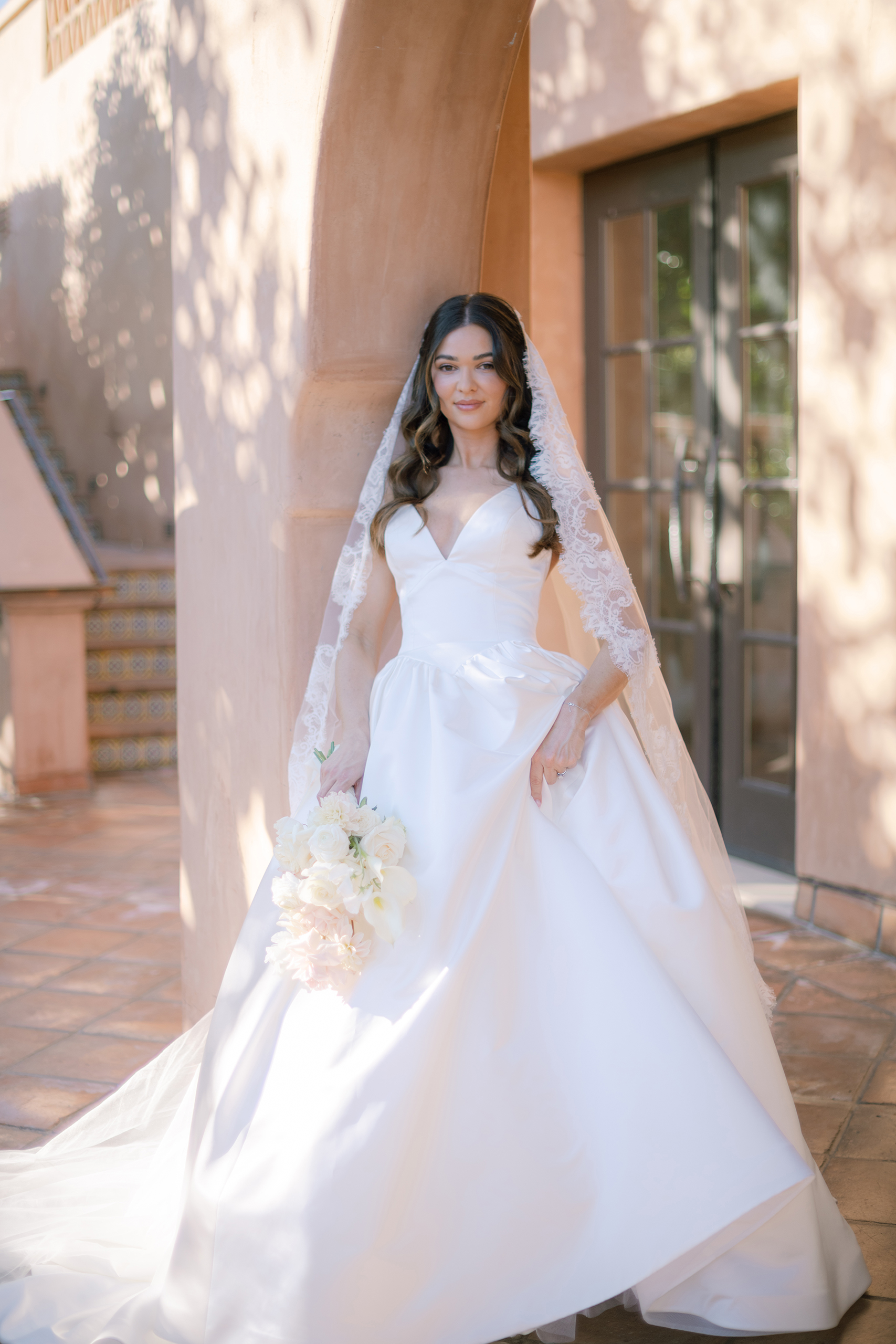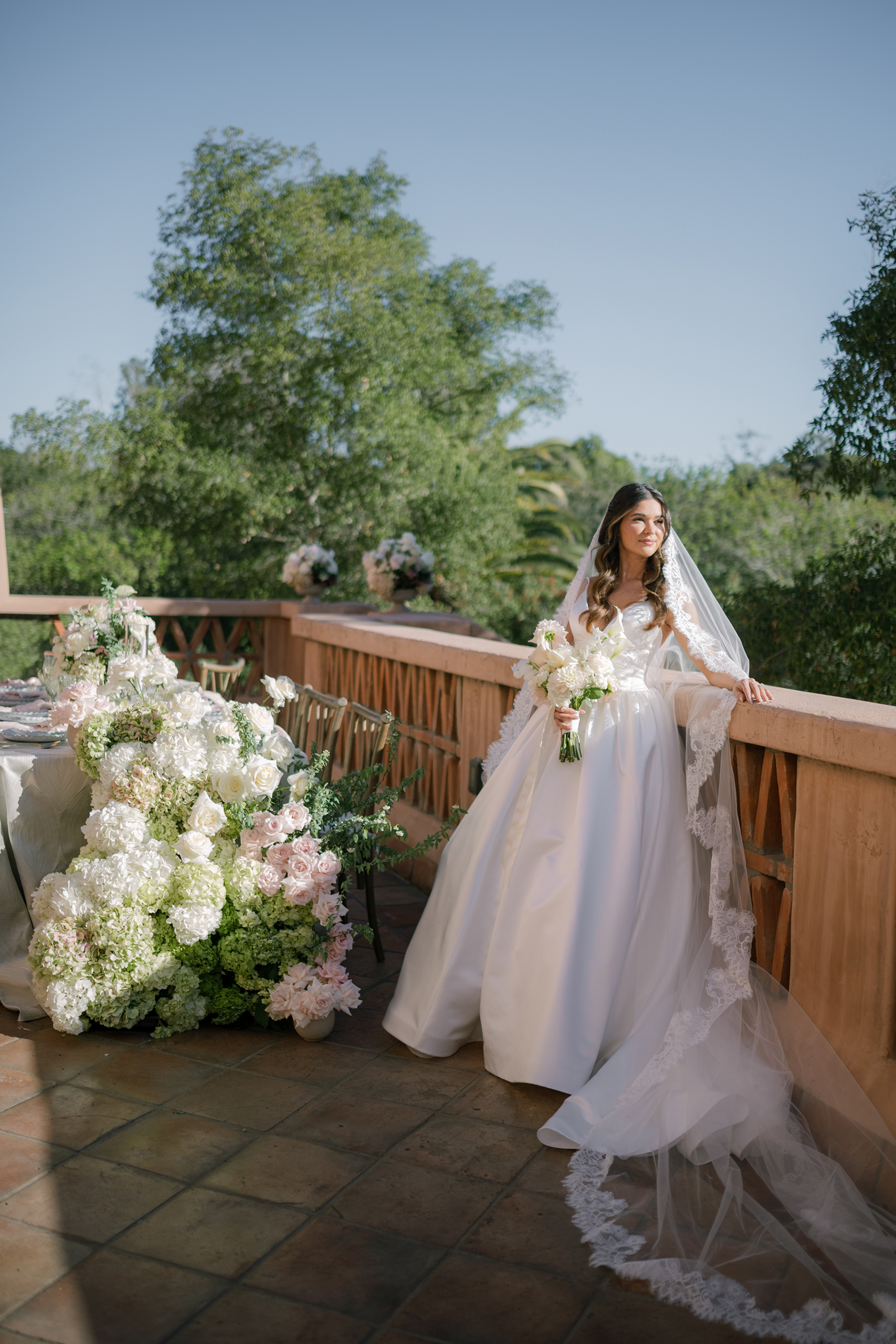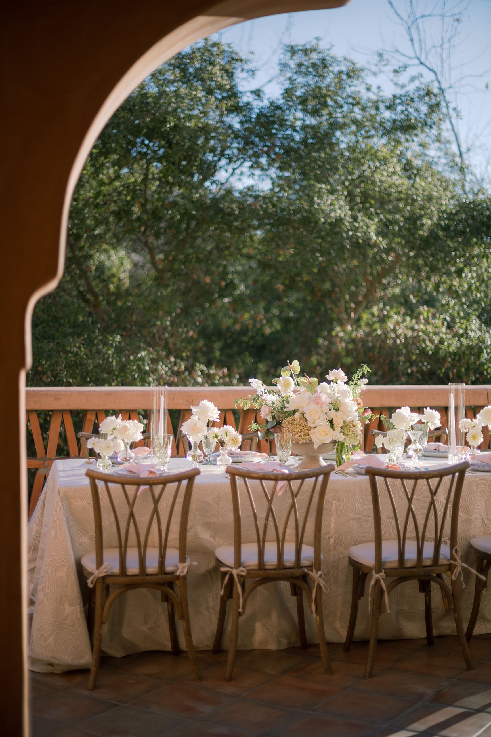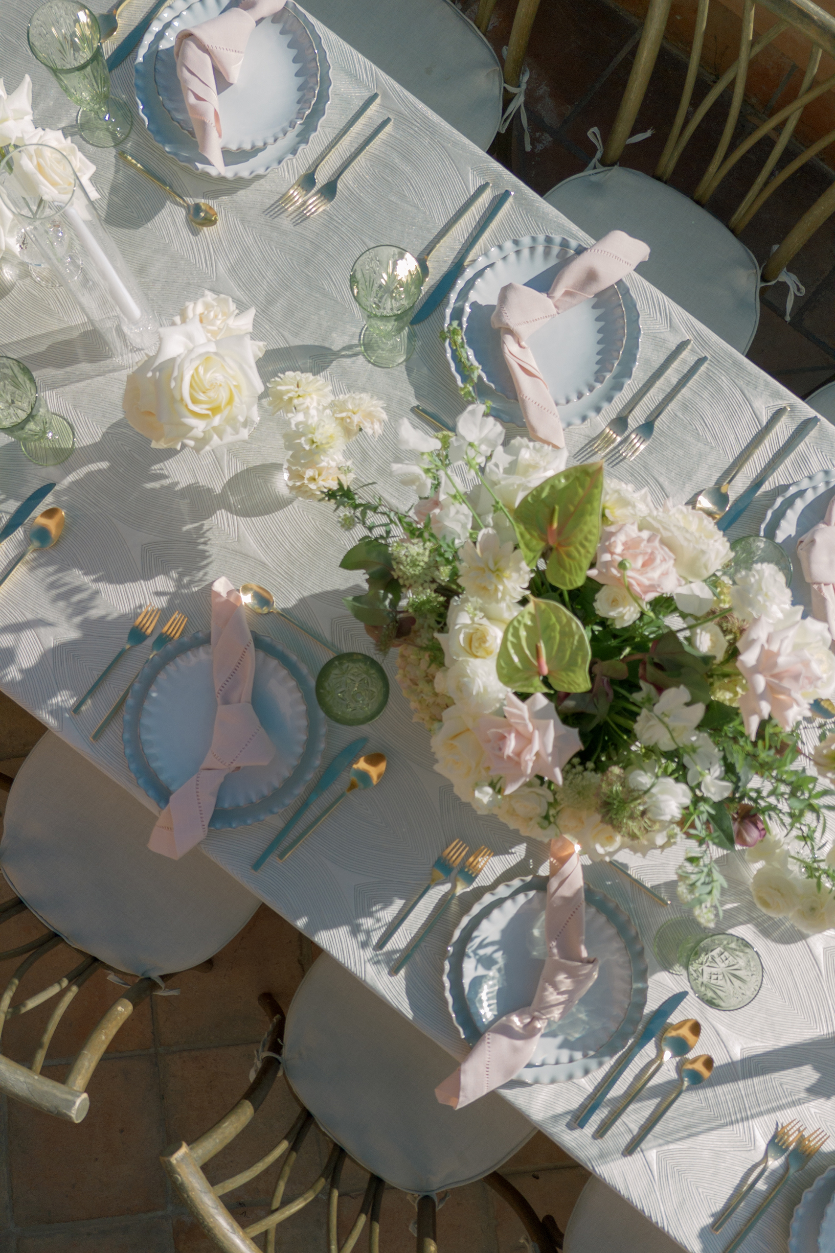 The lush, romantic Mediterranean-inspired Rancho Valencia Resort & Spa in Rancho Santa Fe served as the backdrop for this themed shoot designed to feel “elegant and timeless,” according to Nicole Shadoan of Wedding Agency San Diego. With florist Inna Judelson of Love Zen Floral at the helm, a soft, modern vision of California luxury took shape, and Judelson’s head-turning arrangements were at the heart. According to Shadoan, the focal point of the tablescape was the cascading florals. Since flowers are typically the first thing guests see at a wedding, that first impression was key. Judelson wanted the florals to flow seamlessly with the bride’s classic, glamorous style, meant to “stay in your mind, like a fairy-tale love story forever.” She chose flowers that were “simultaneously elegant, timeless, and modern,” mixing Quicksand roses, antique and white hydrangeas, and dahlias, with touches of anthurium, Japanese sweet peas, hellebores, and calla lilies. “I also used Amaranthus to create a dramatic, romantic vibe,” Judelson explained. Shadoan elevated the tablescape with subtle pops of color, textured linen, green glassware, and blush napkins, giving the shoot that “extra luxurious feel.”