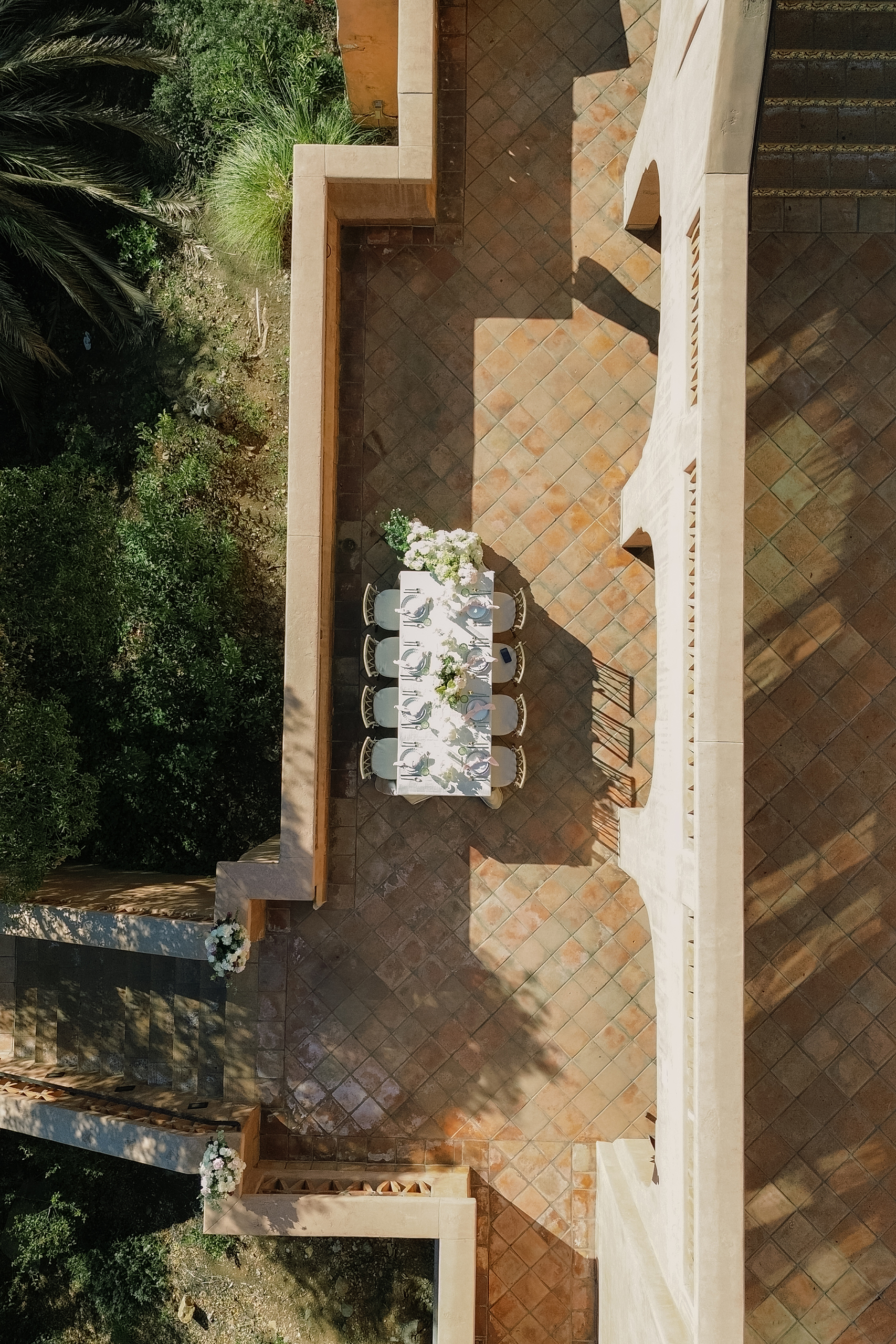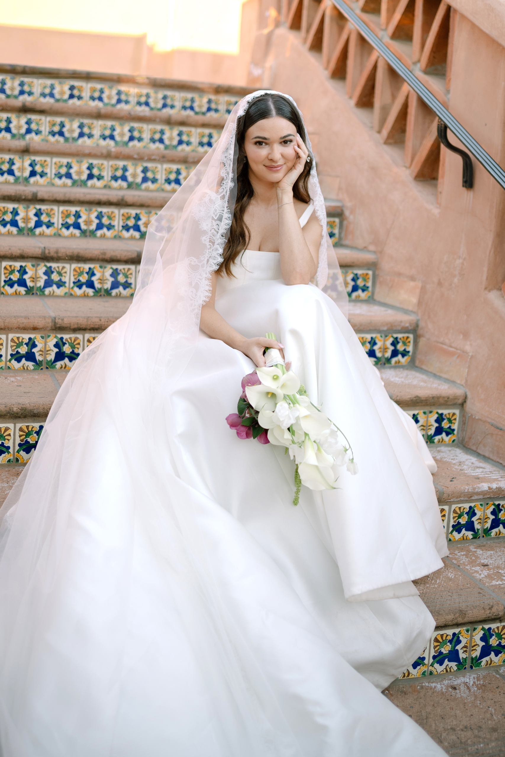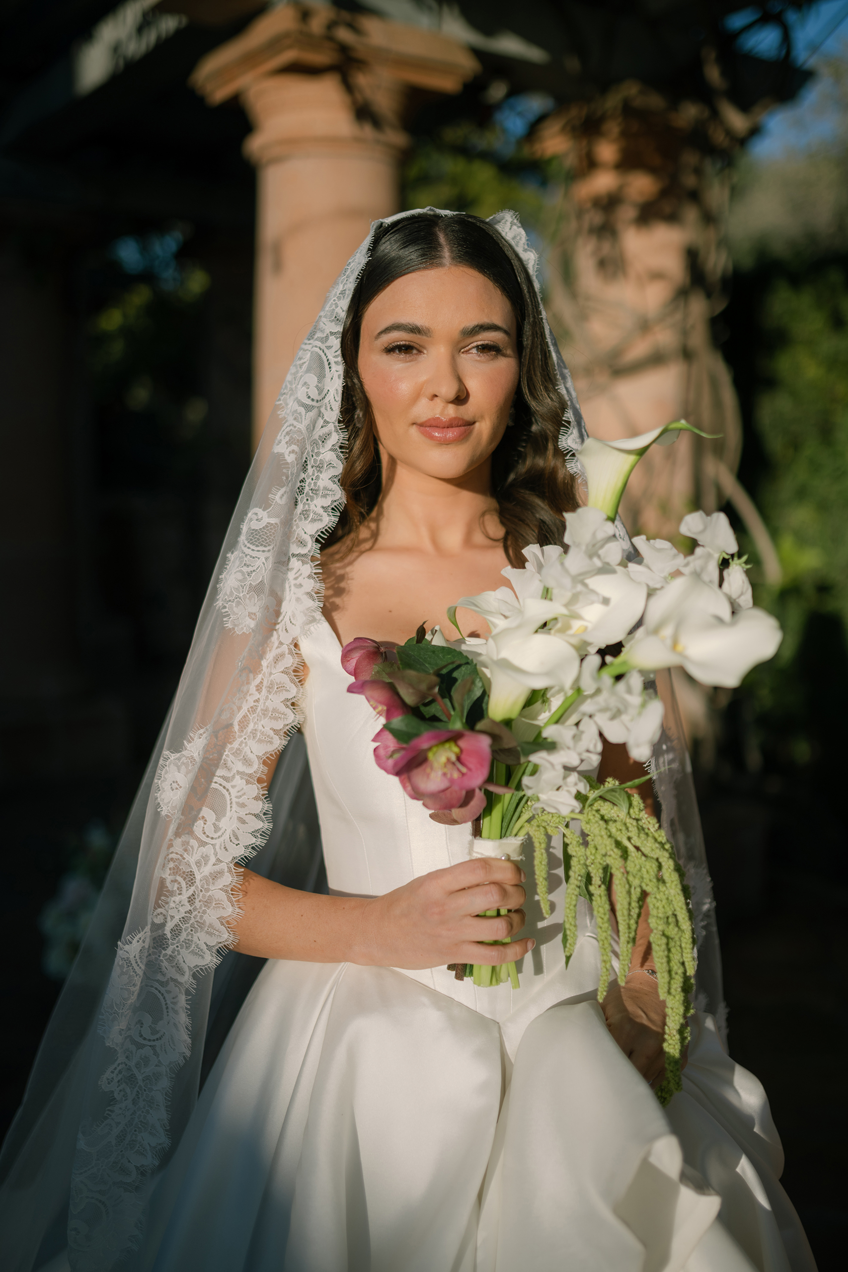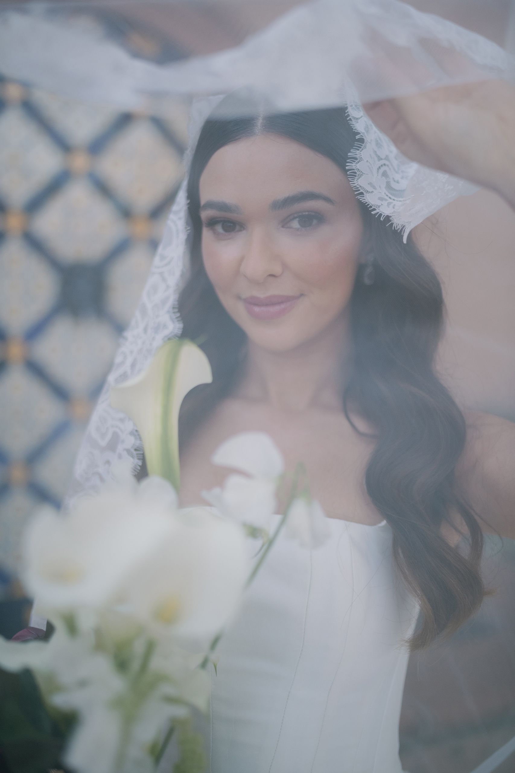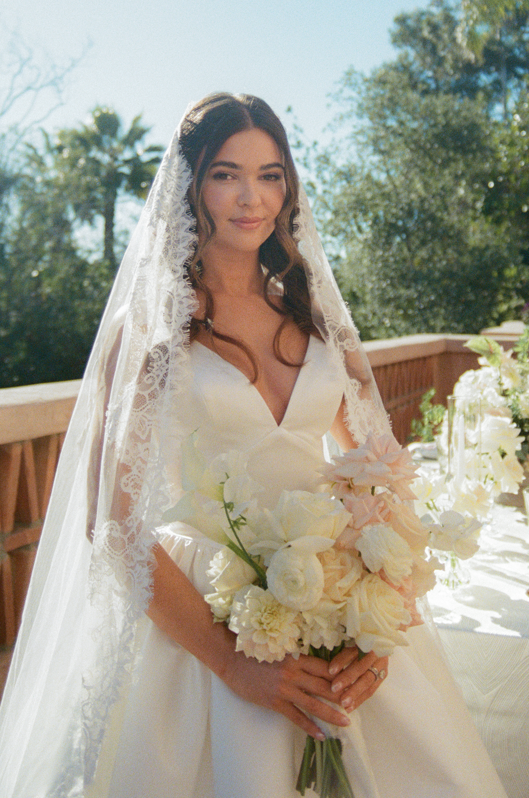The lush, romantic Mediterranean-inspired Rancho Valencia Resort & Spa in Rancho Santa Fe served as the backdrop for this themed shoot designed to feel “elegant and timeless,” according to Nicole Shadoan of Wedding Agency San Diego. With florist Inna Judelson of Love Zen Floral at the helm, a soft, modern vision of California luxury took shape, and Judelson’s head-turning arrangements were at the heart. According to Shadoan, the focal point of the tablescape was the cascading florals. Since flowers are typically the first thing guests see at a wedding, that first impression was key. Judelson wanted the florals to flow seamlessly with the bride’s classic, glamorous style, meant to “stay in your mind, like a fairy-tale love story forever.” She chose flowers that were “simultaneously elegant, timeless, and modern,” mixing Quicksand roses, antique and white hydrangeas, and dahlias, with touches of anthurium, Japanese sweet peas, hellebores, and calla lilies. “I also used Amaranthus to create a dramatic, romantic vibe,” Judelson explained. Shadoan elevated the tablescape with subtle pops of color, textured linen, green glassware, and blush napkins, giving the shoot that “extra luxurious feel.”