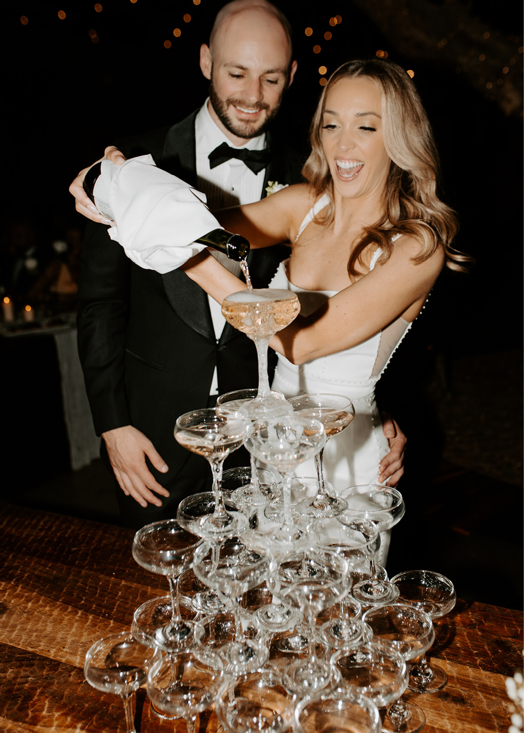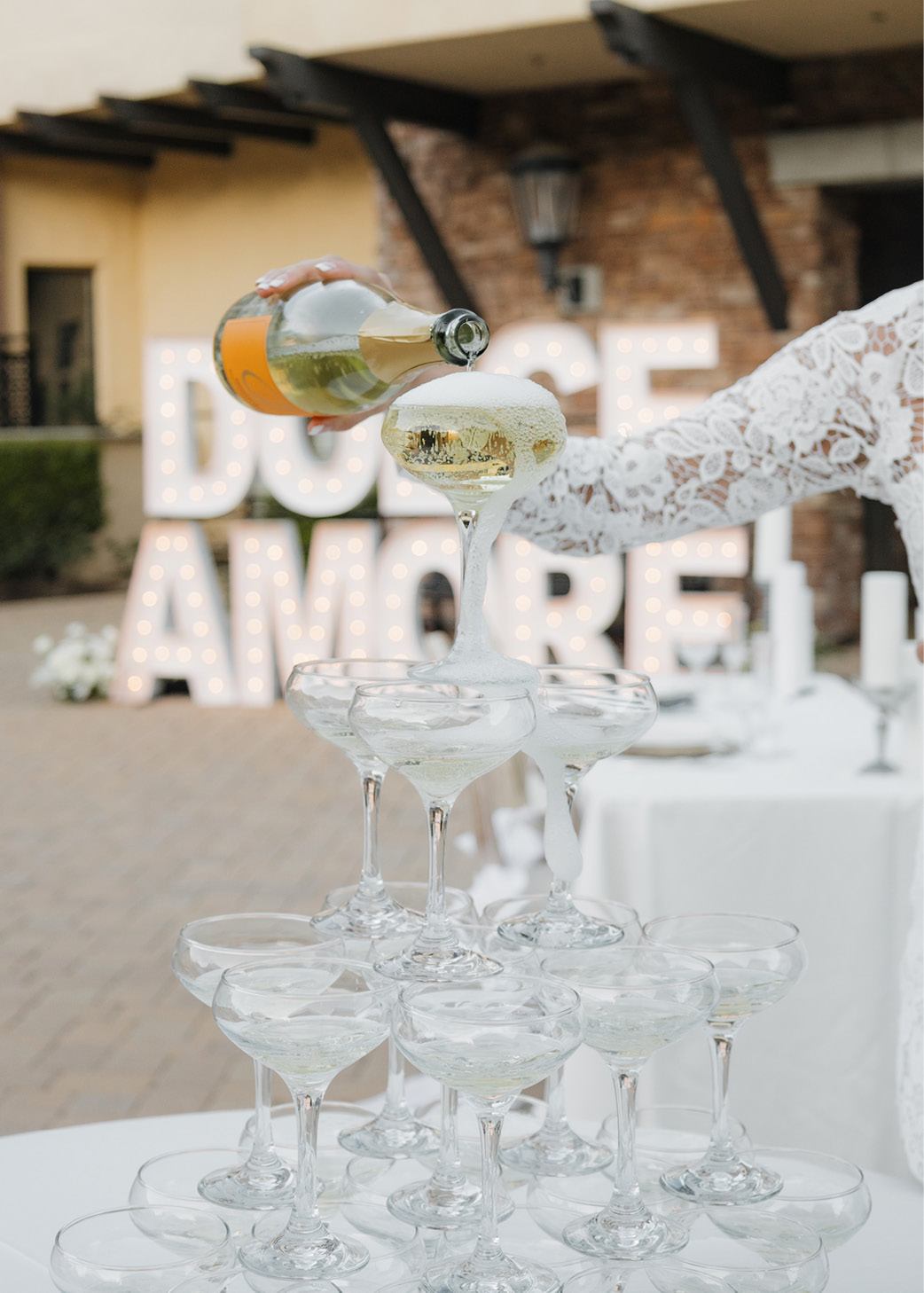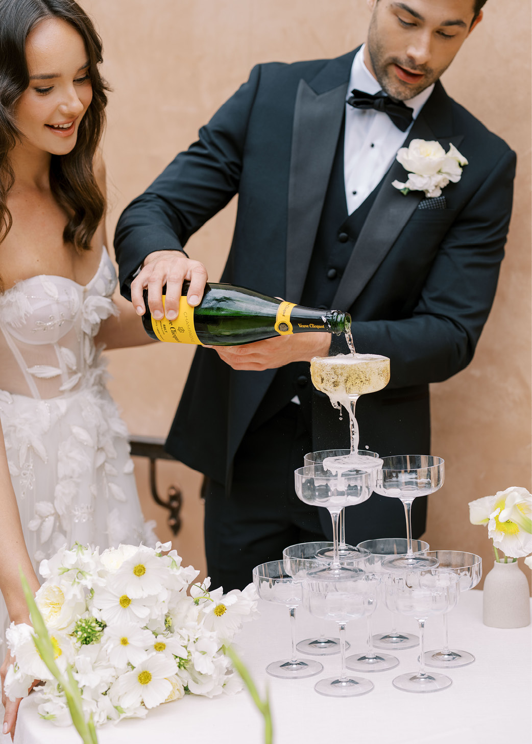 Cascading coupes, sparkling bubbles, and a touch of old-world glamour redefine the wedding toast!