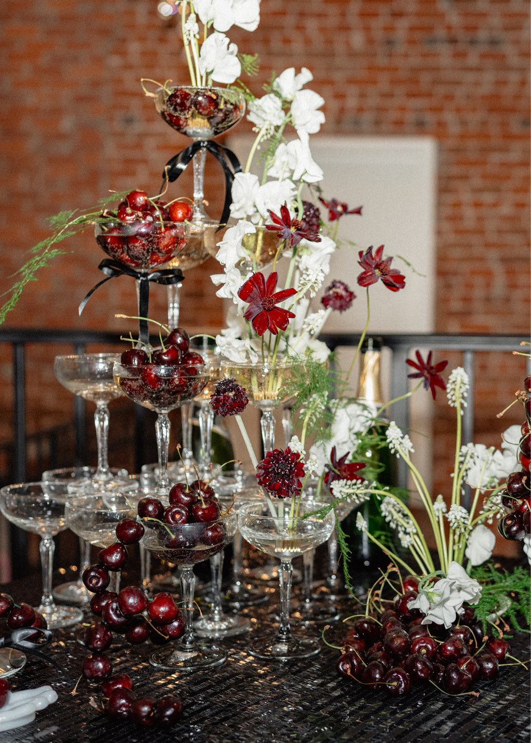 Champagne towers are also being artfully decorated with cascading florals, delicate bows, and fresh fruit, transforming them into striking visual centerpieces. These thoughtful embellishments add layers of texture and color, creating an elevated, photogenic moment that feels both celebratory and fashion-forward.