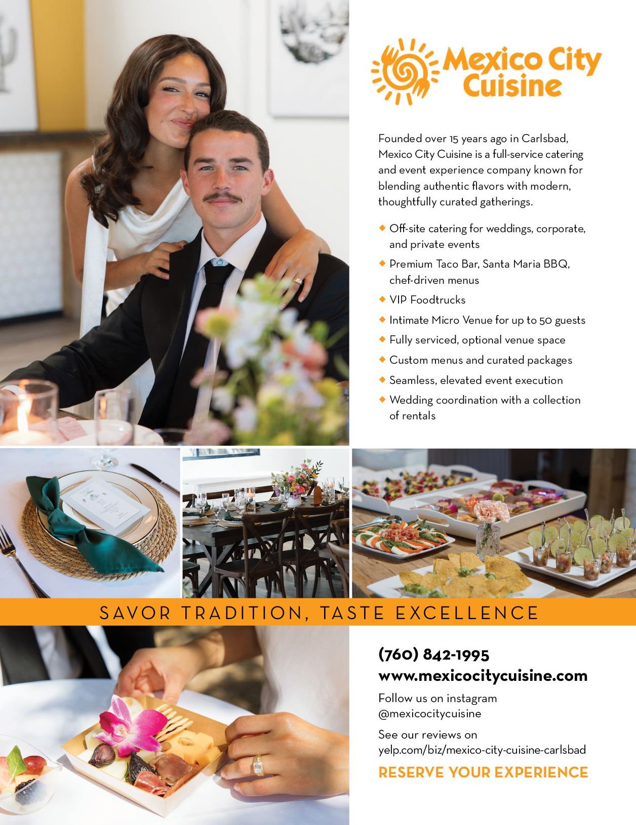 Founded over 15 years ago in Carlsbad, Mexico City Cuisine is a full-service catering and event experience company known for blending authentic flavors with modern, thoughtfully curated gatherings. We specialize in off-site catering for weddings, corporate events, and private celebrations, offering Premium Taco Bar, Santa Maria-style BBQ, and refined, chef-driven menus. In addition to catering, we offer an intimate Micro Venue experience for intimate gatherings of up to 50 guests, providing a fully serviced, optional venue. With curated packages, customizable menus, and seamless execution, we create elevated, memorable events wherever you choose to host. VIP Foodtrucks also available.