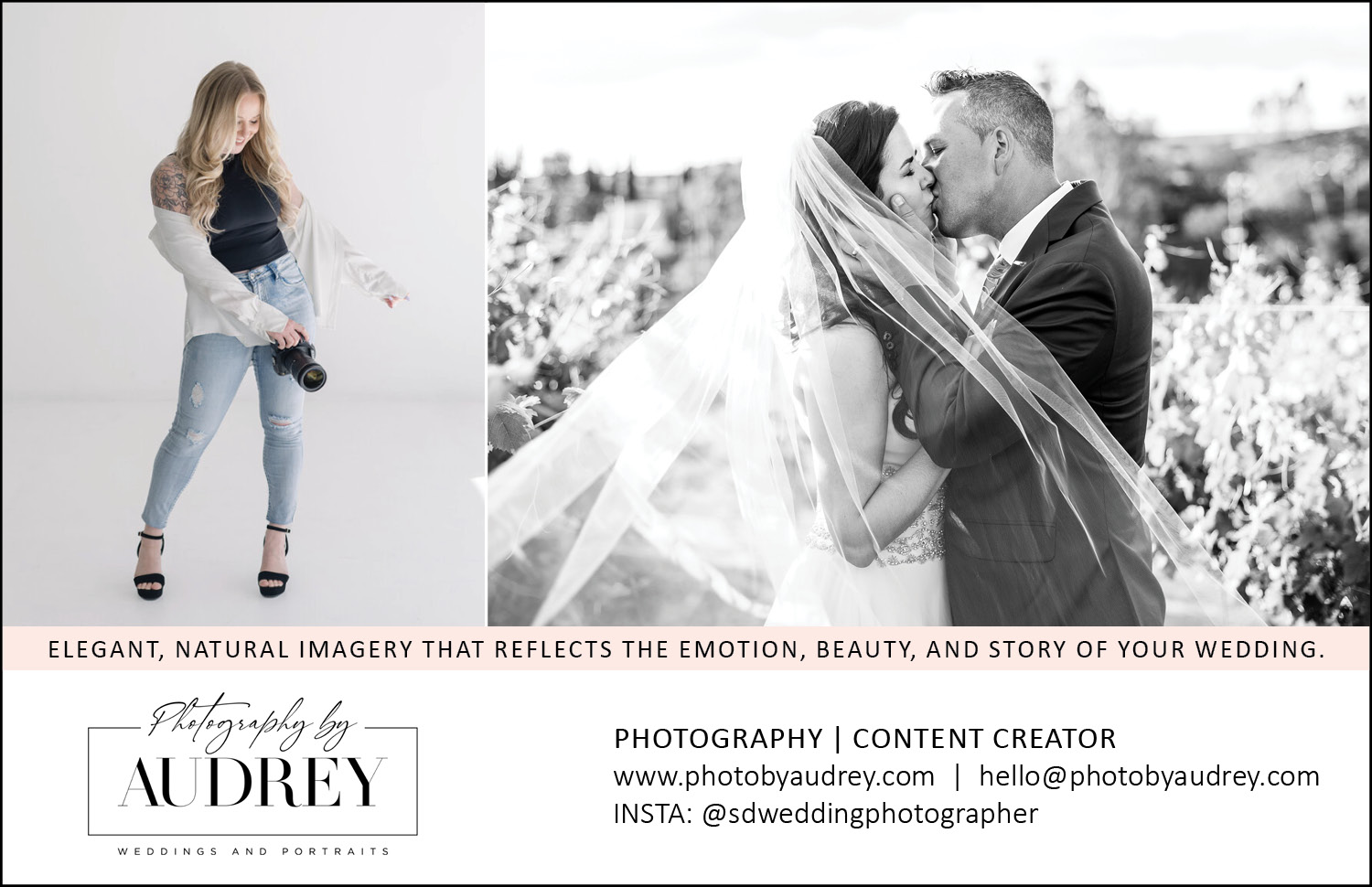 Effortless, elegant, and thoughtfully guided, Photography by Audrey captures San Diego weddings with a refined, natural approach. With over a decade of experience, Audrey uses soft light and genuine emotion to create a seamless experience, documenting moments as they unfold into timeless, artful imagery that feels elevated and deeply personal.