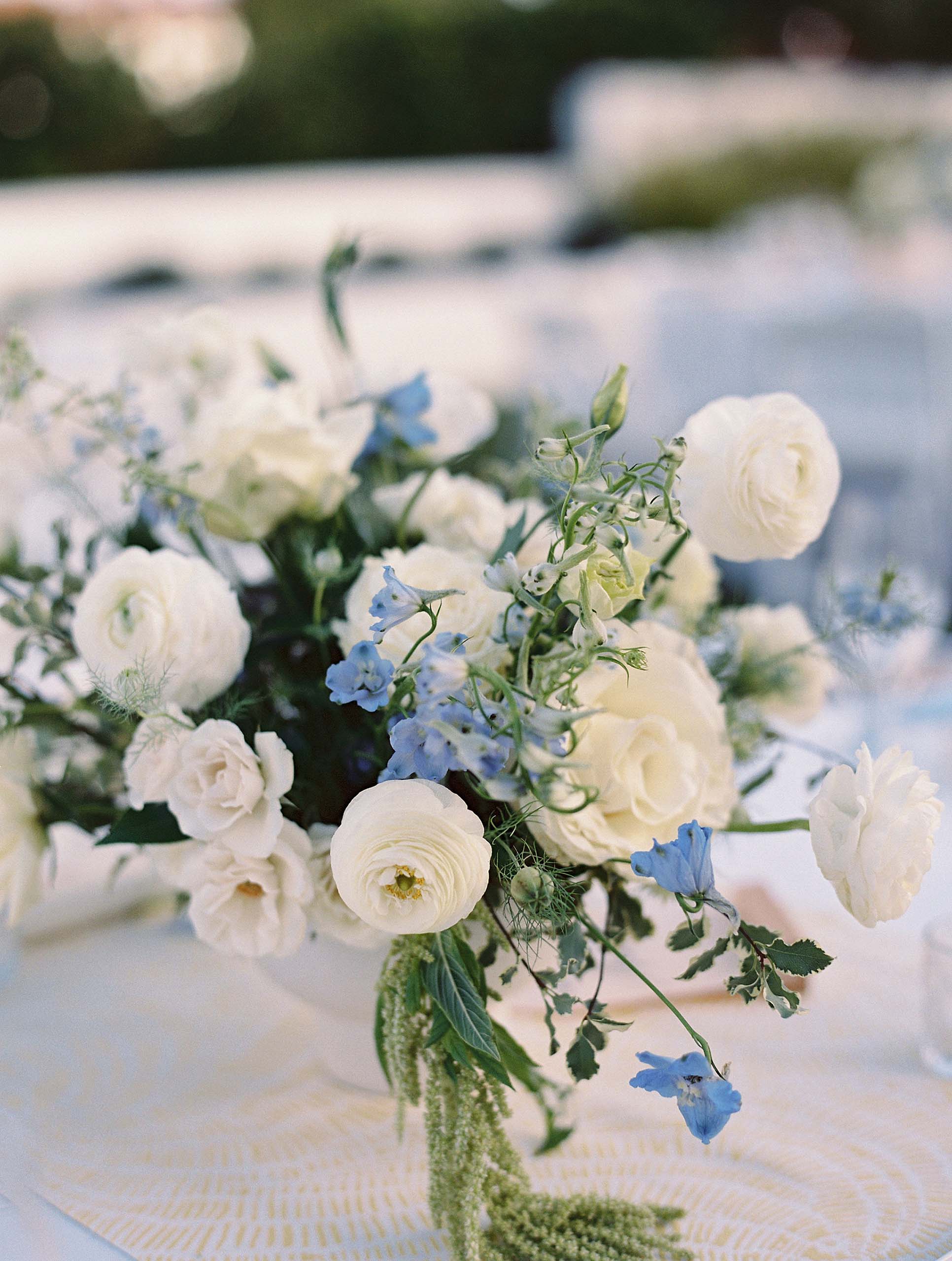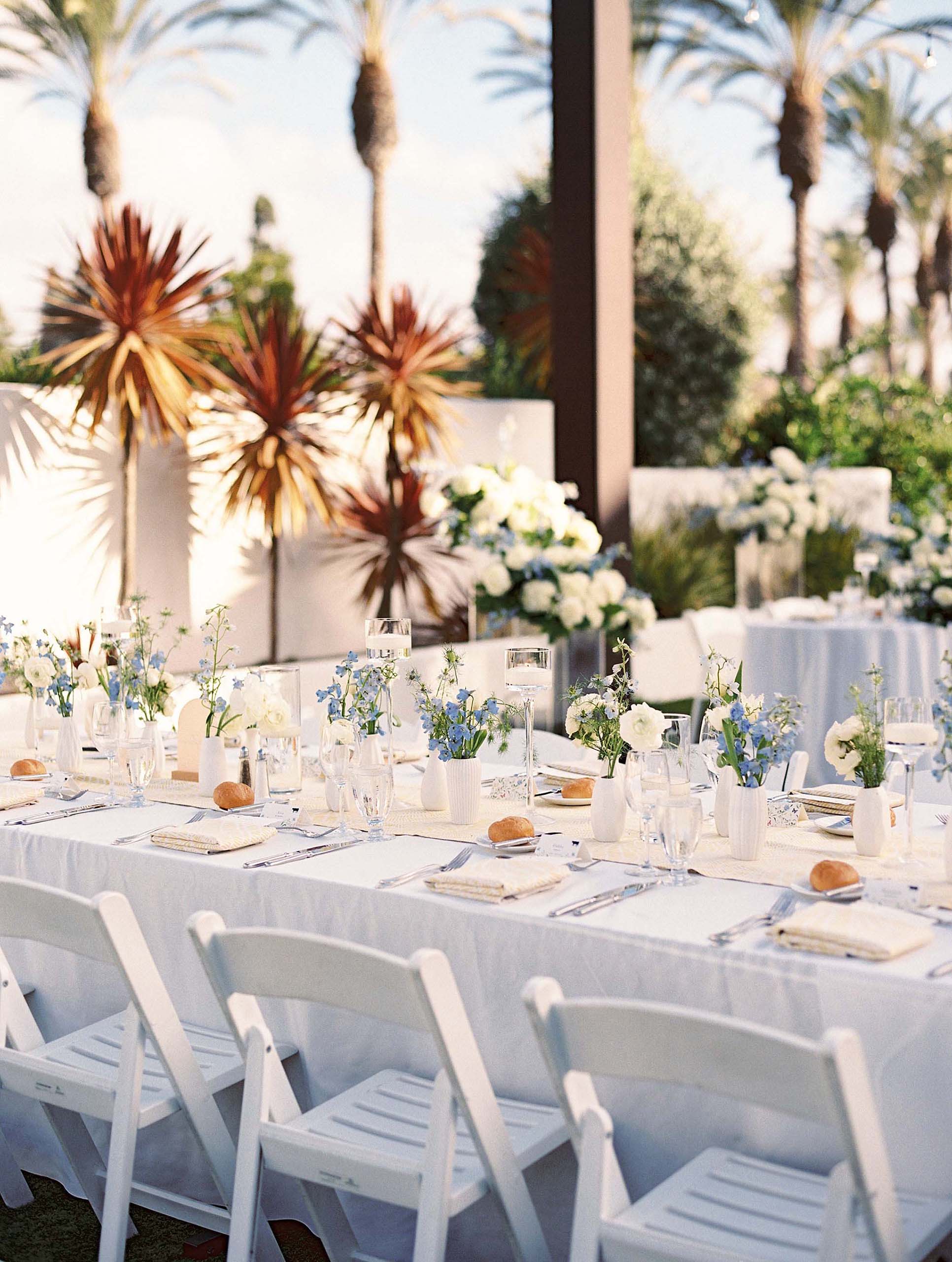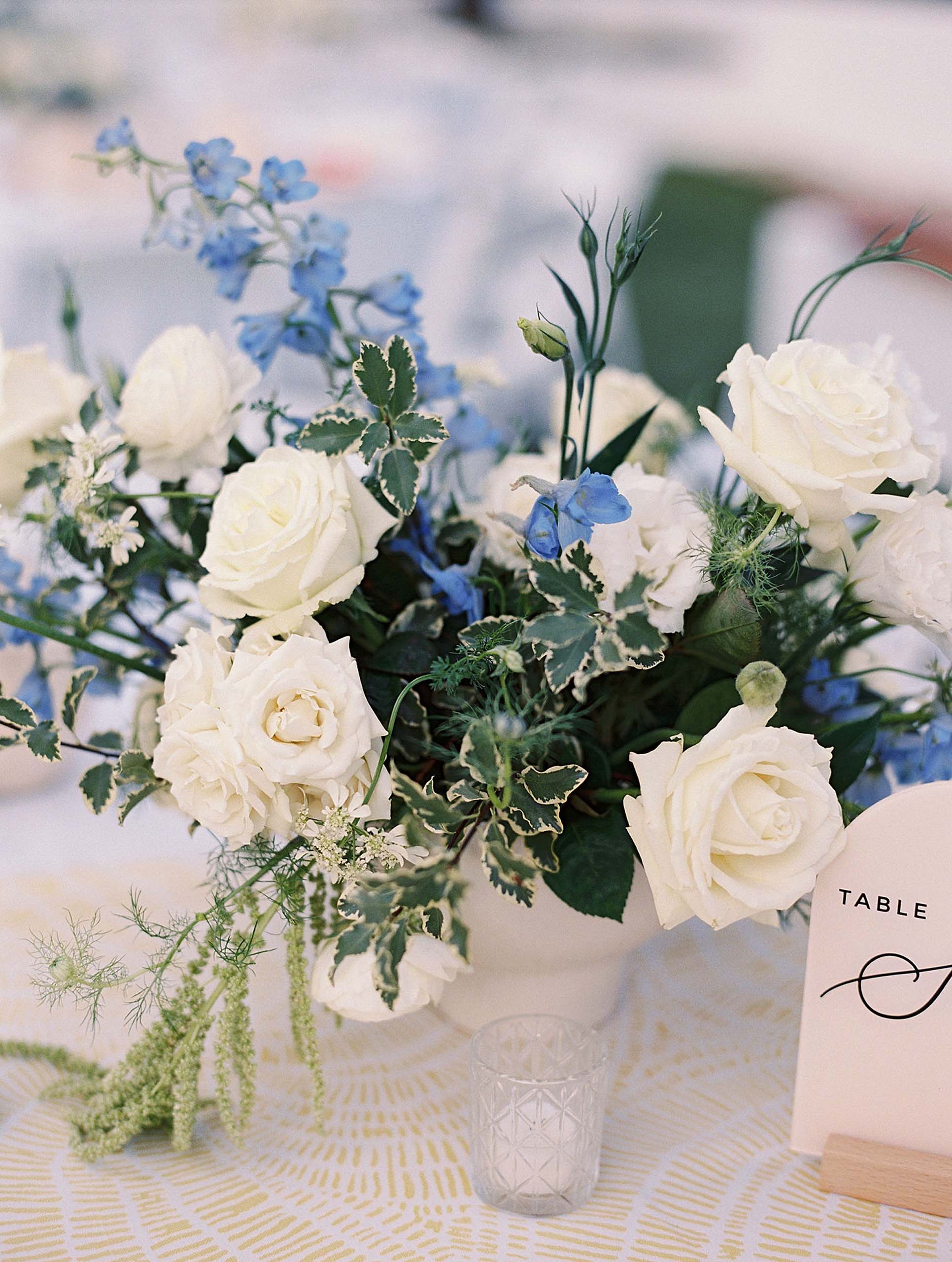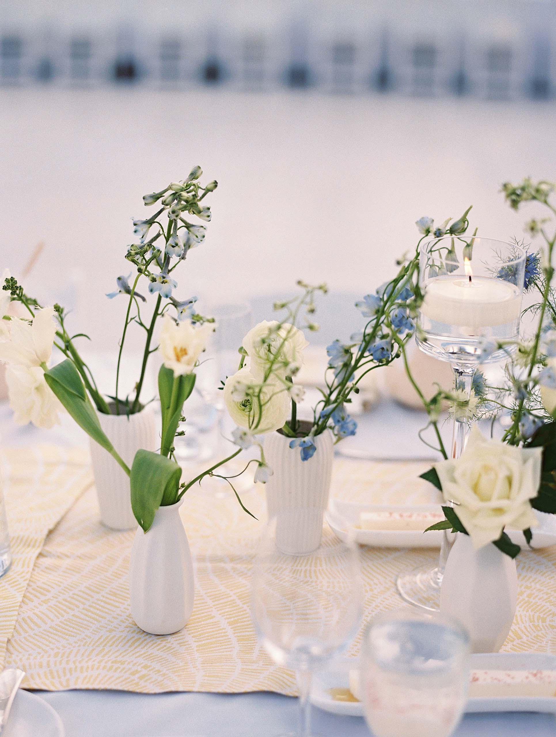Florals by Studio Fleurish featured soft ivory blooms with greenery and touches of baby blue, while light yellow accents brought warmth to the tablescapes and stationery.