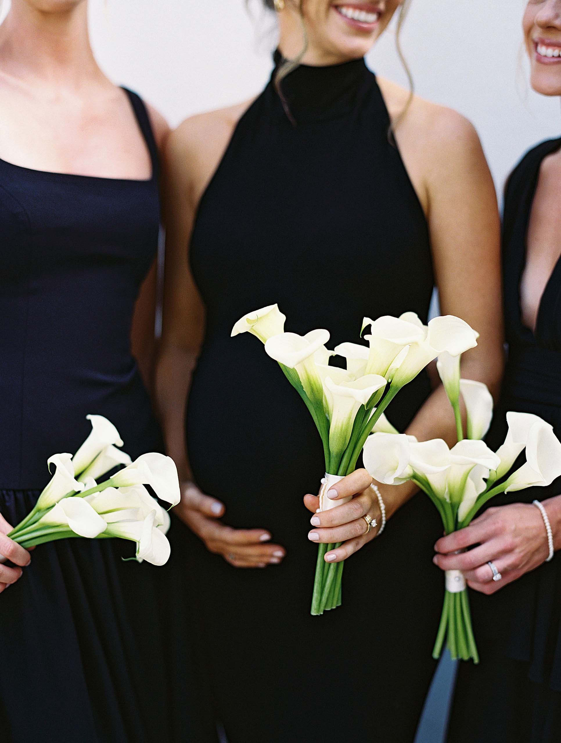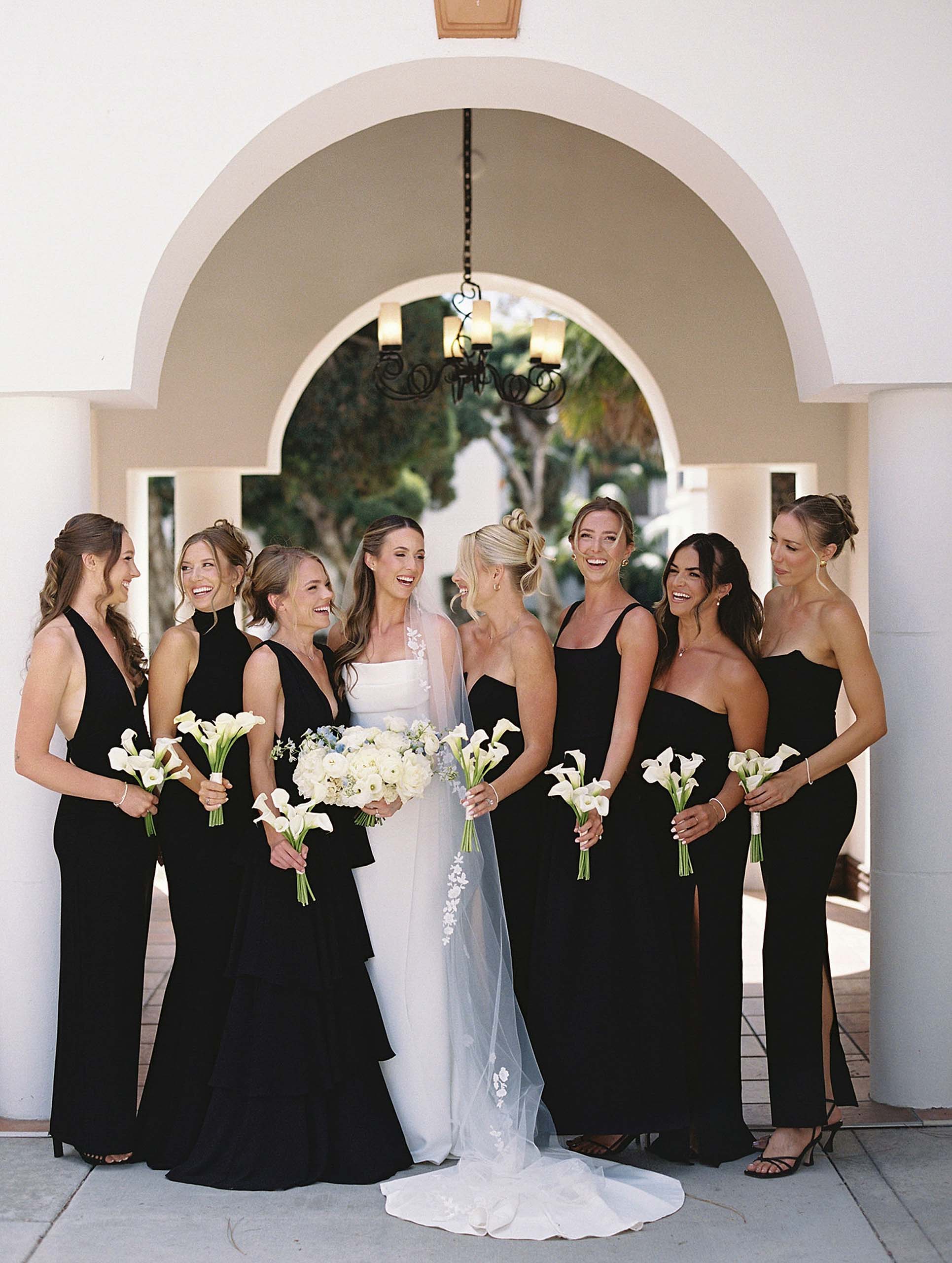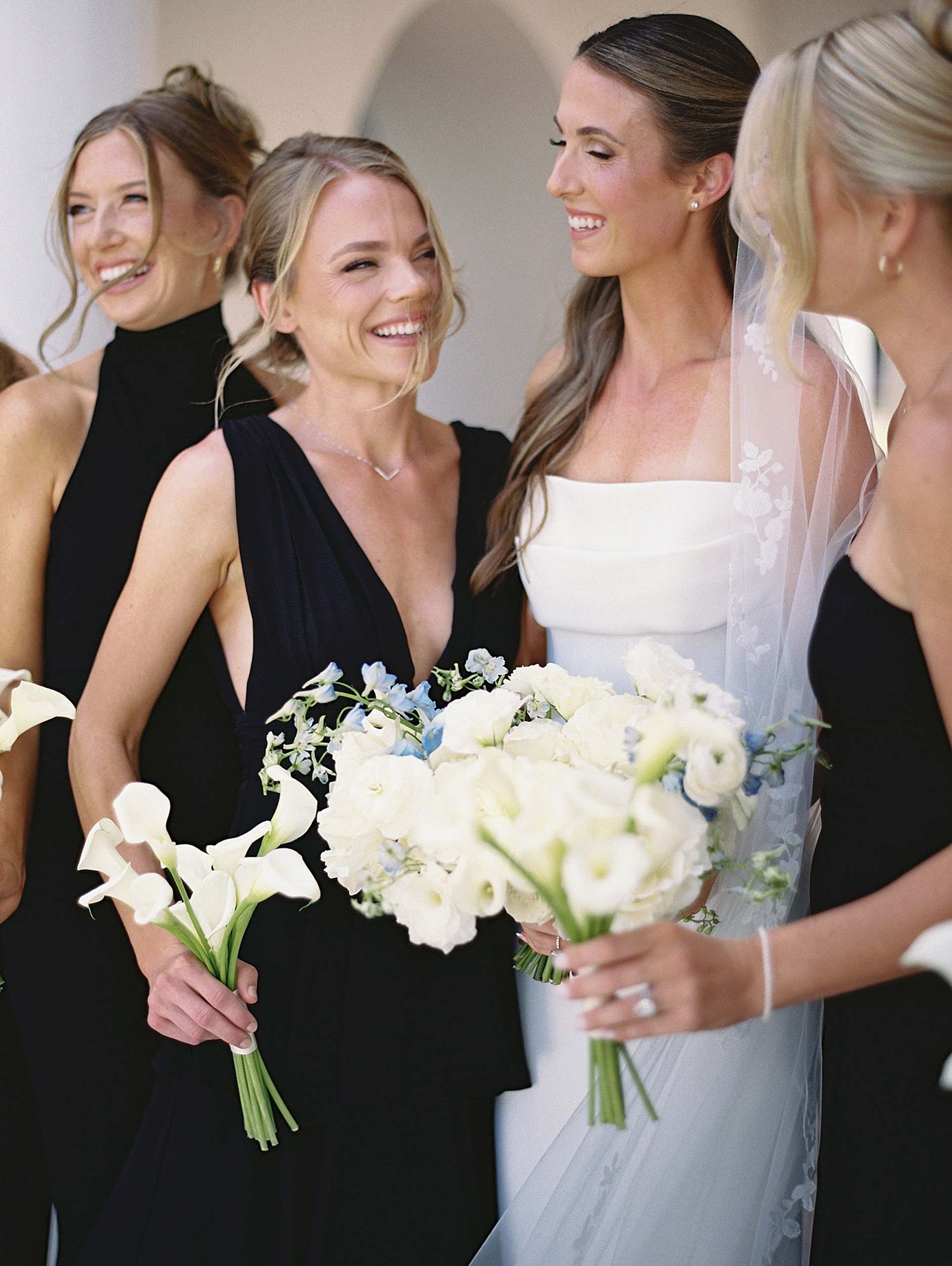 Courtney’s vision for the day was intentionally clean and timeless, allowing the surrounding landscape and architecture to shine. Bridesmaids wore long black gowns while groomsmen dressed in classic black tuxedos, creating a polished look for the couple’s large wedding party of sixteen bridesmaids and fourteen groomsmen.
