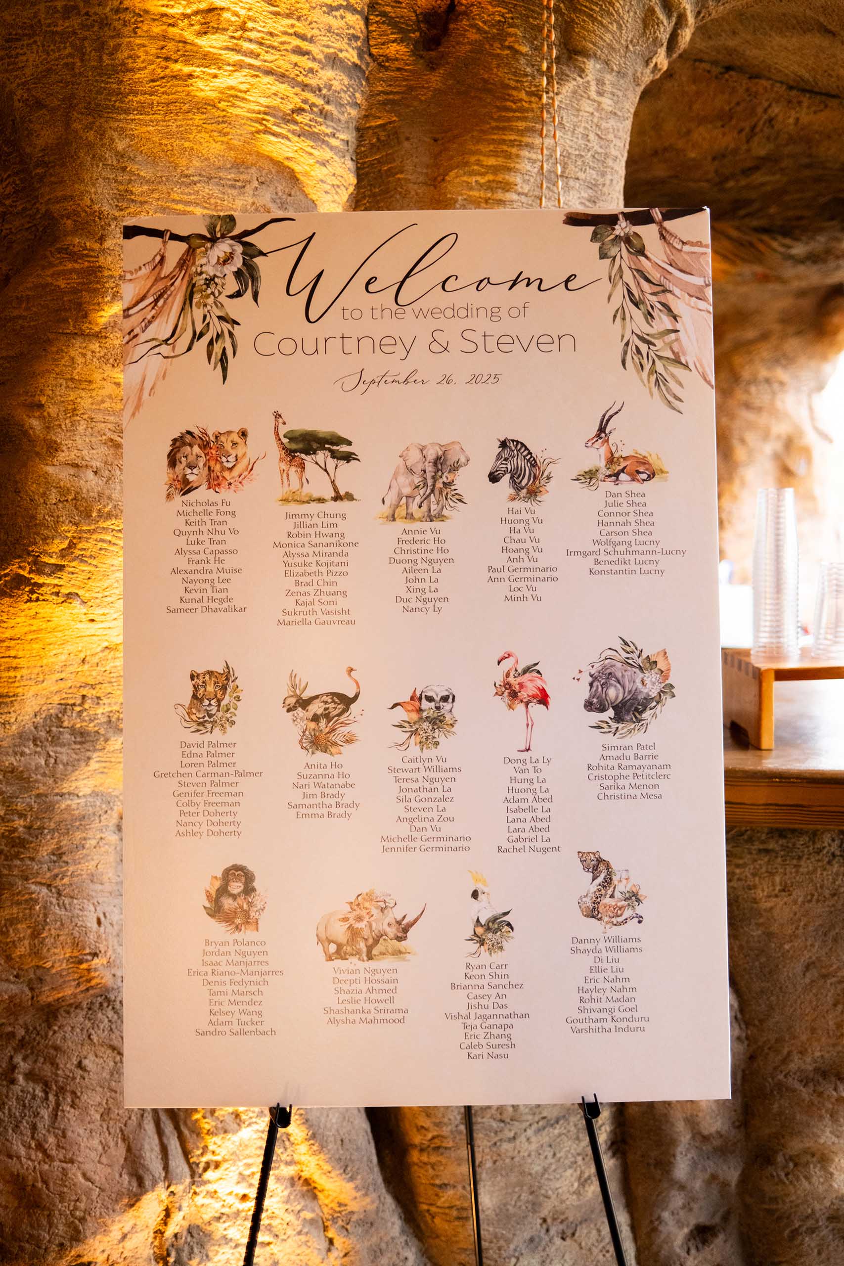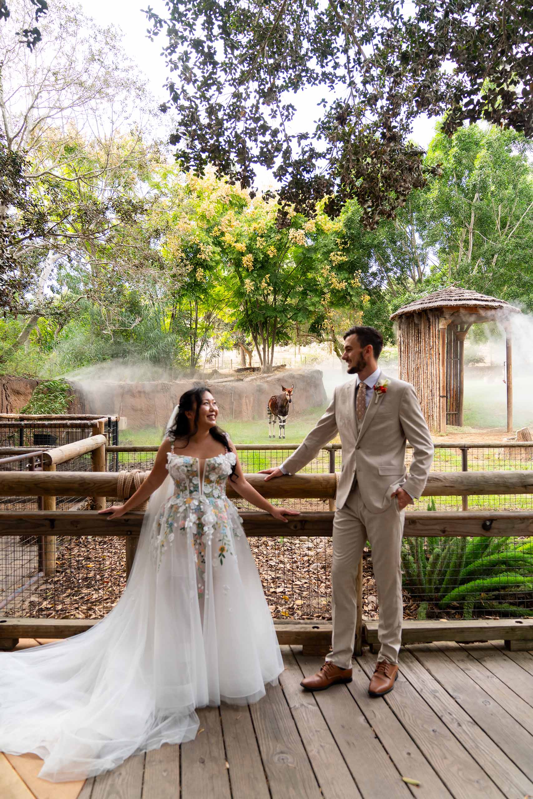 Courtney and Steven celebrated their nuptials surrounded by panoramic savanna views at the breathtaking San Diego Zoo Safari Park. Their ceremony and reception took place at Kijamii Overlook, where guests gathered to witness a day that blended personal traditions and playful details.