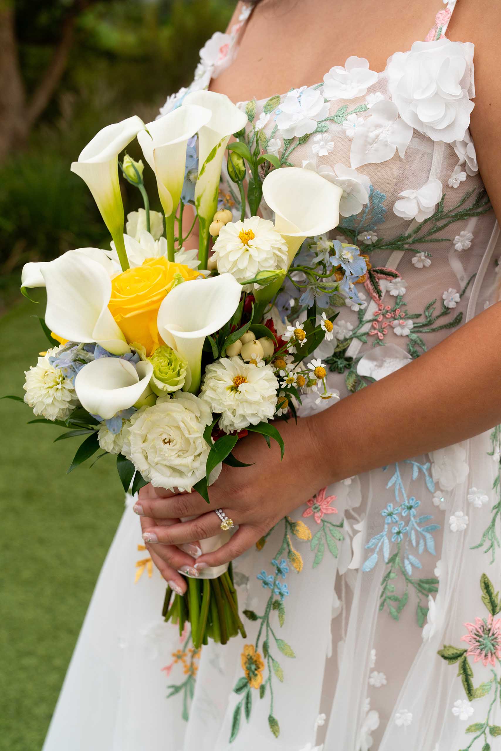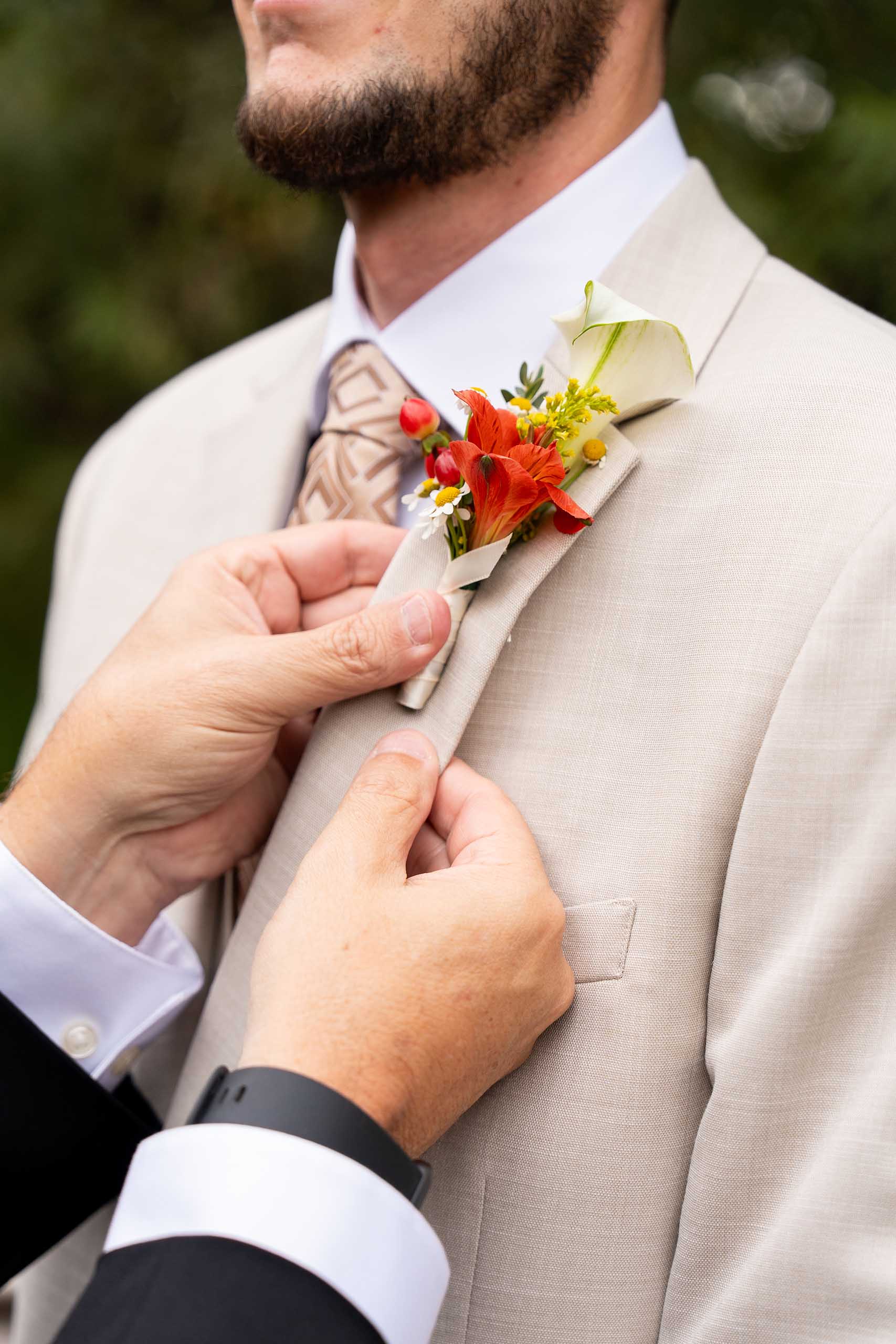 Courtney wore the Bloom gown by Dany Tabet, featuring colorful floral embroidery that echoed the wildflower palette of the day. She paired it with a Daydream veil from The White Flower and Betsey Johnson heels. Steven wore a tan suit from Friar Tux with a geometric tie inspired by safari patterns.