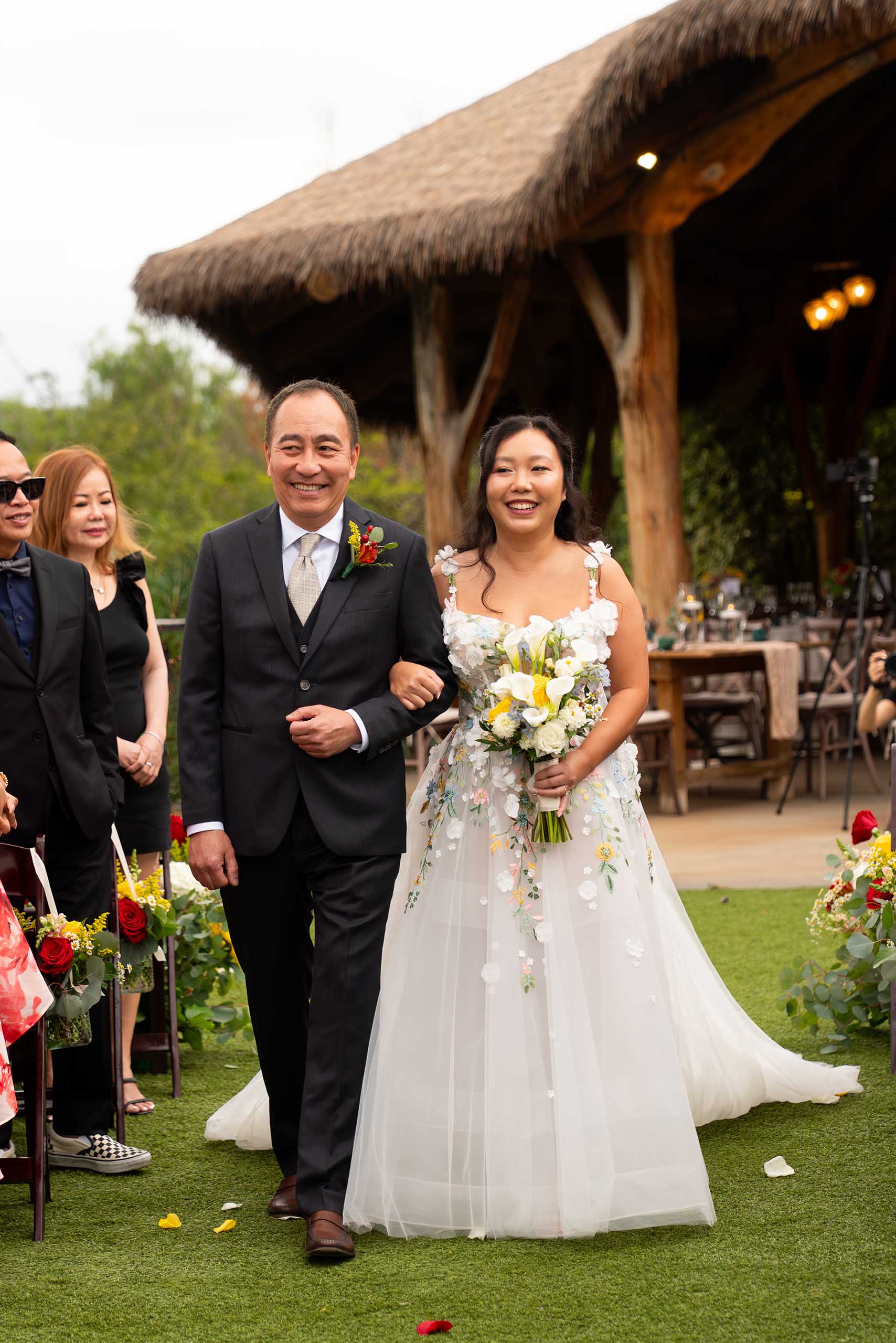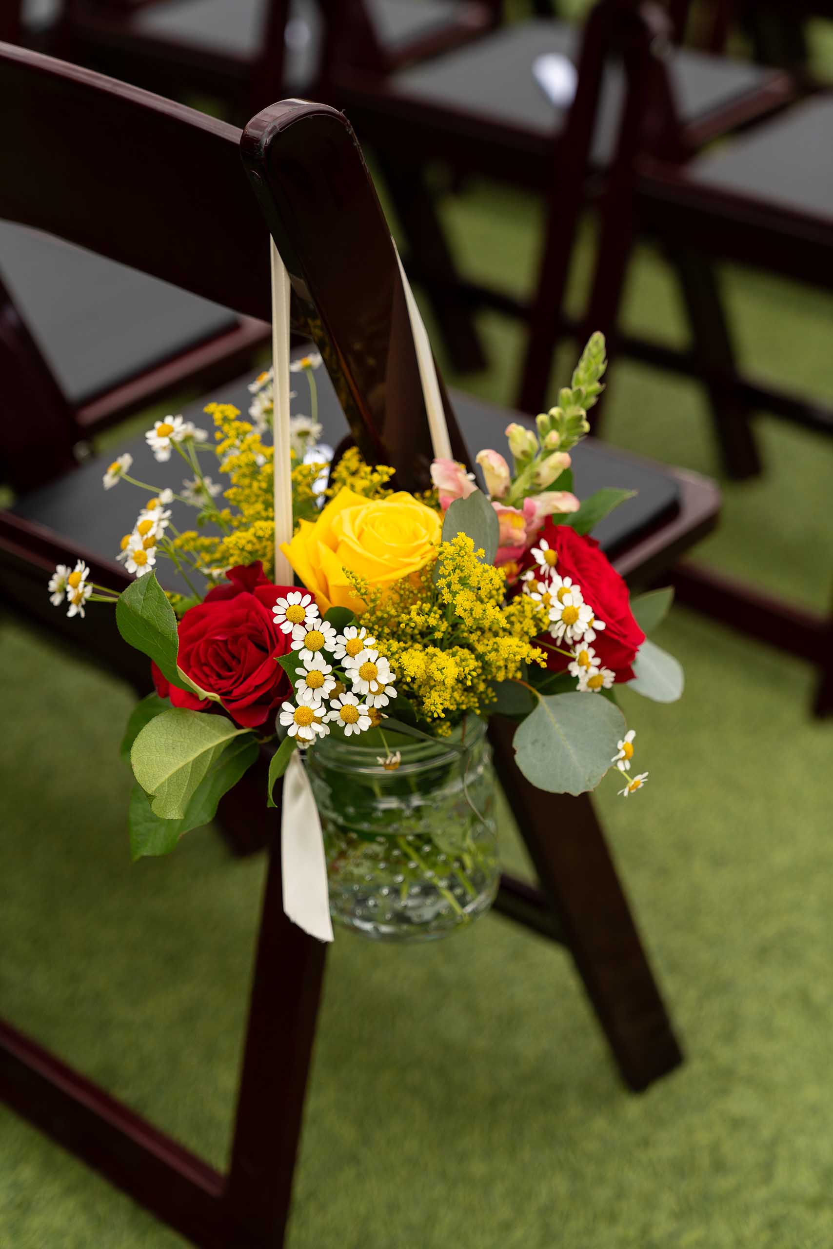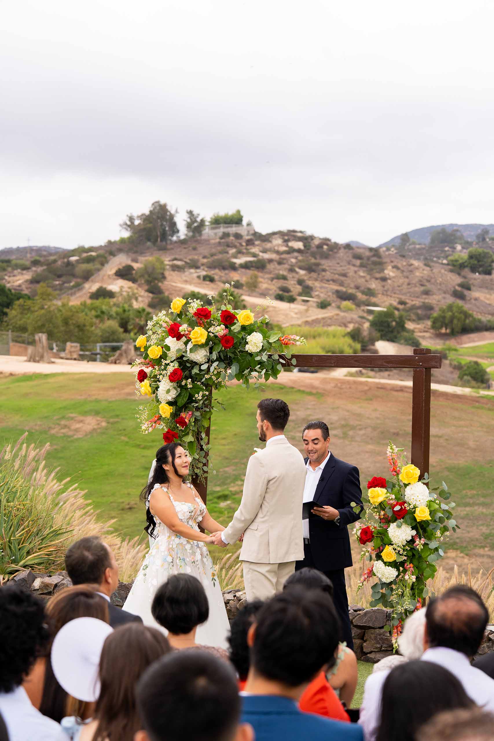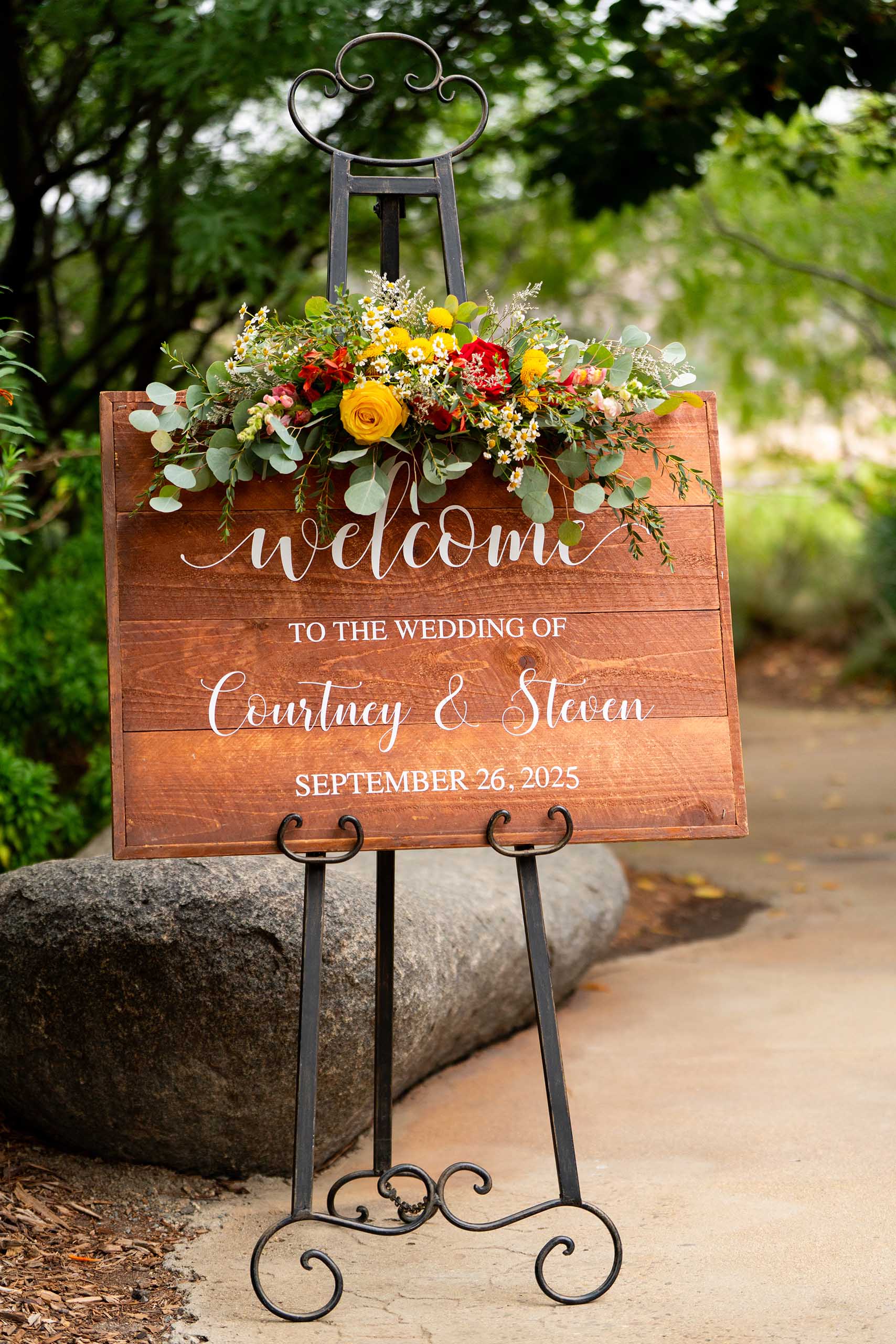 At the ceremony, Courtney and Steven exchanged vows beneath a rectangular floral arch filled with wildflowers in vibrant reds, oranges, yellows, and greens. Steven walked down the aisle to an orchestral version of “Can You Feel the Love Tonight” from The Lion King, while Courtney entered to an orchestral arrangement of “Akuma No Ko” from Attack on Titan.