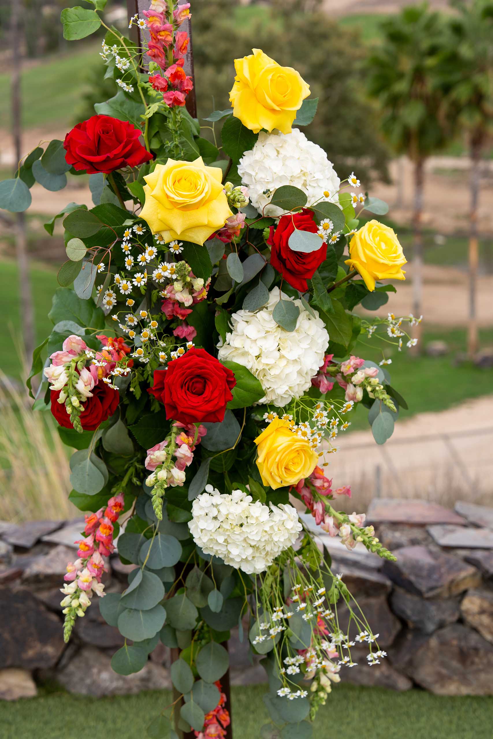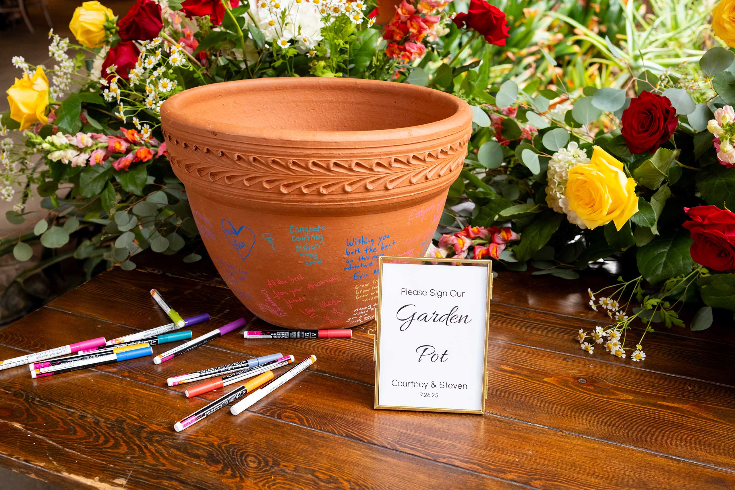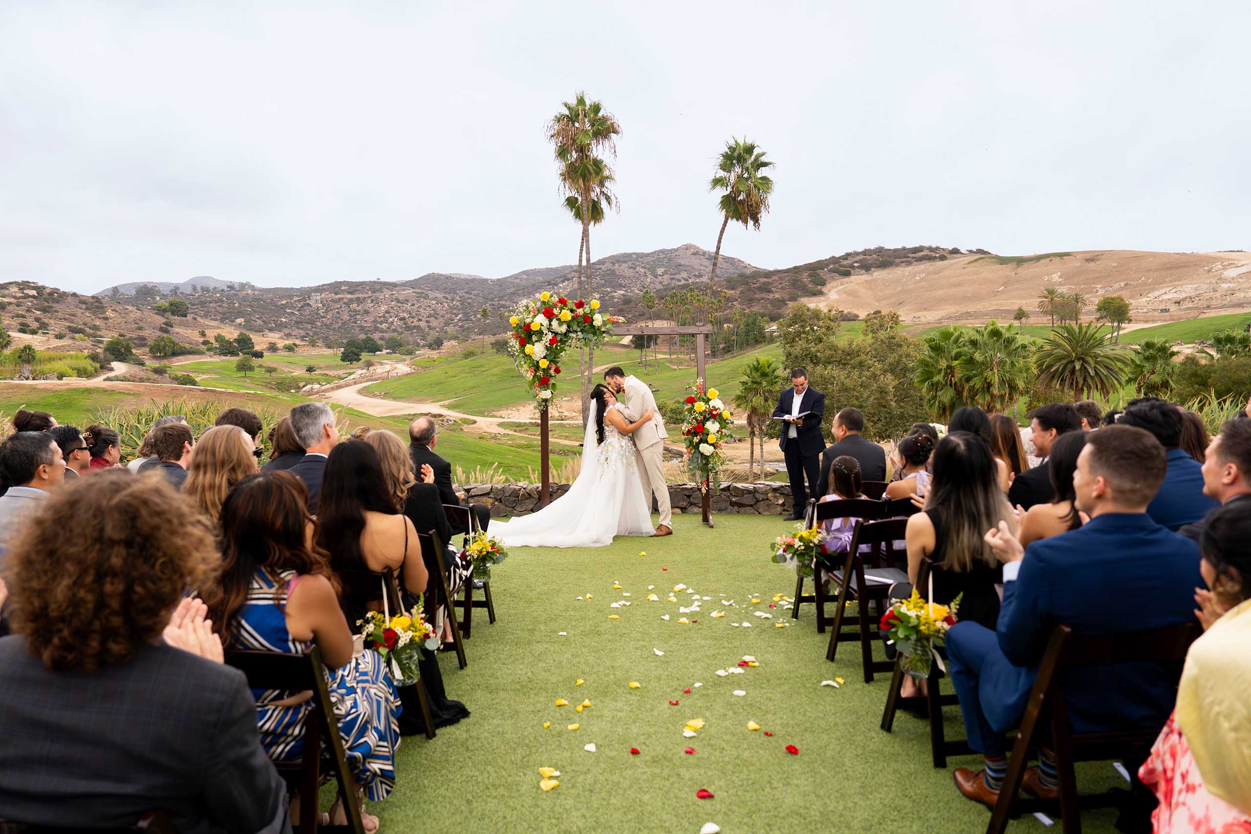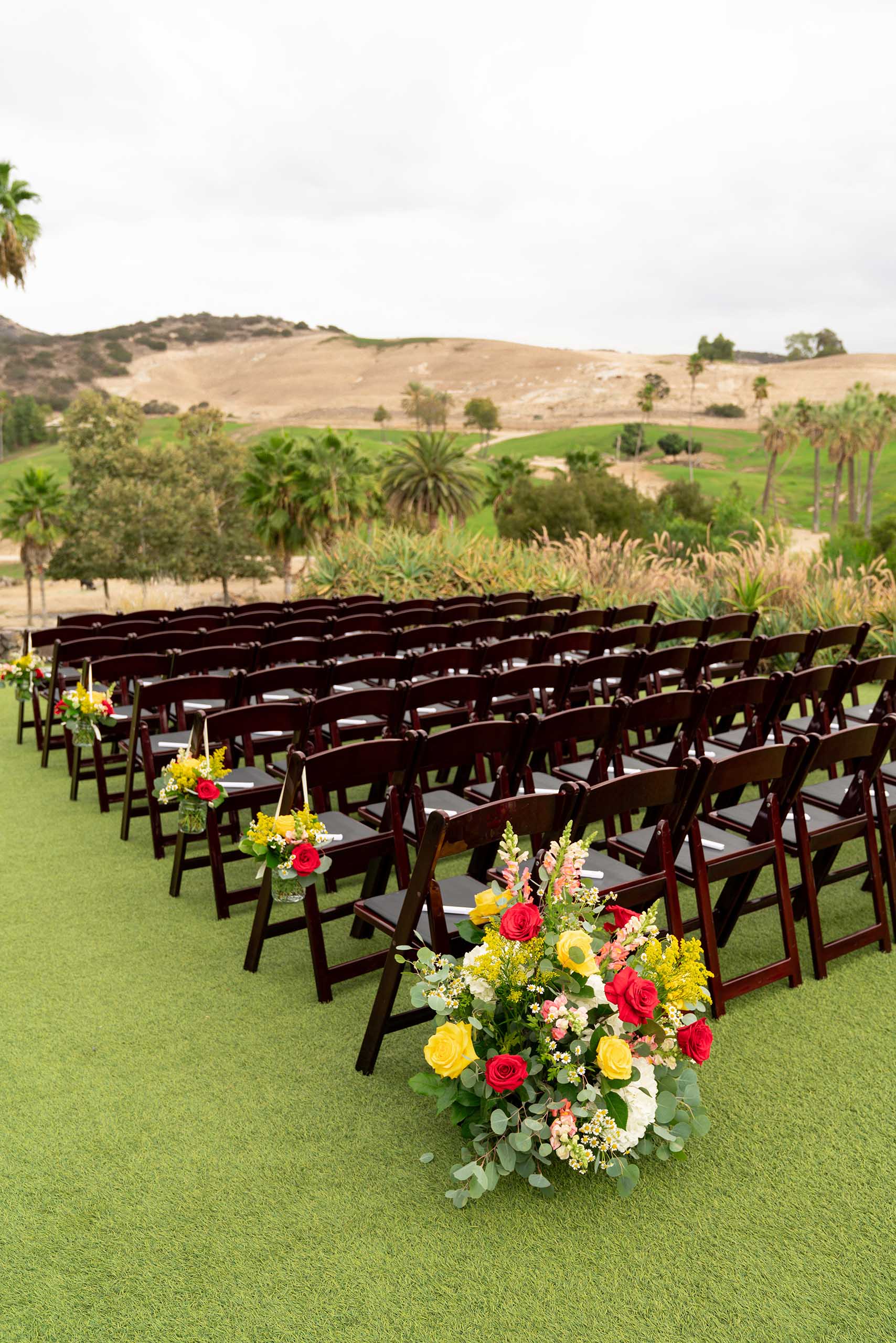At the ceremony, Courtney and Steven exchanged vows beneath a rectangular floral arch filled with wildflowers in vibrant reds, oranges, yellows, and greens. Steven walked down the aisle to an orchestral version of “Can You Feel the Love Tonight” from The Lion King, while Courtney entered to an orchestral arrangement of “Akuma No Ko” from Attack on Titan.