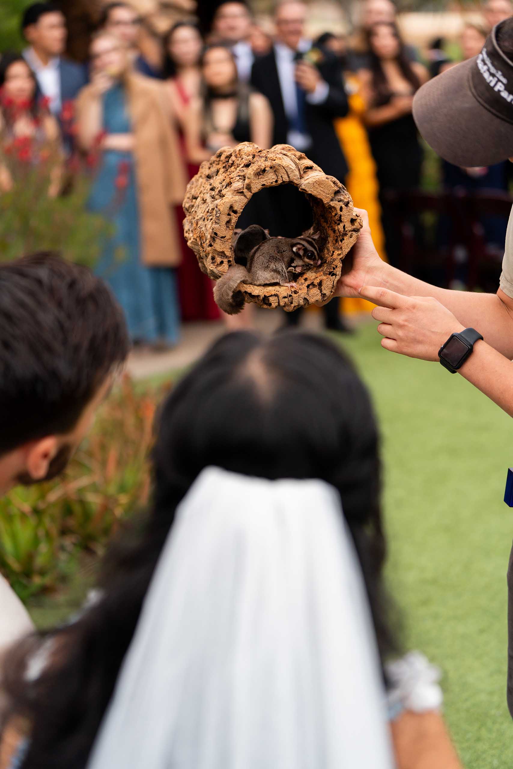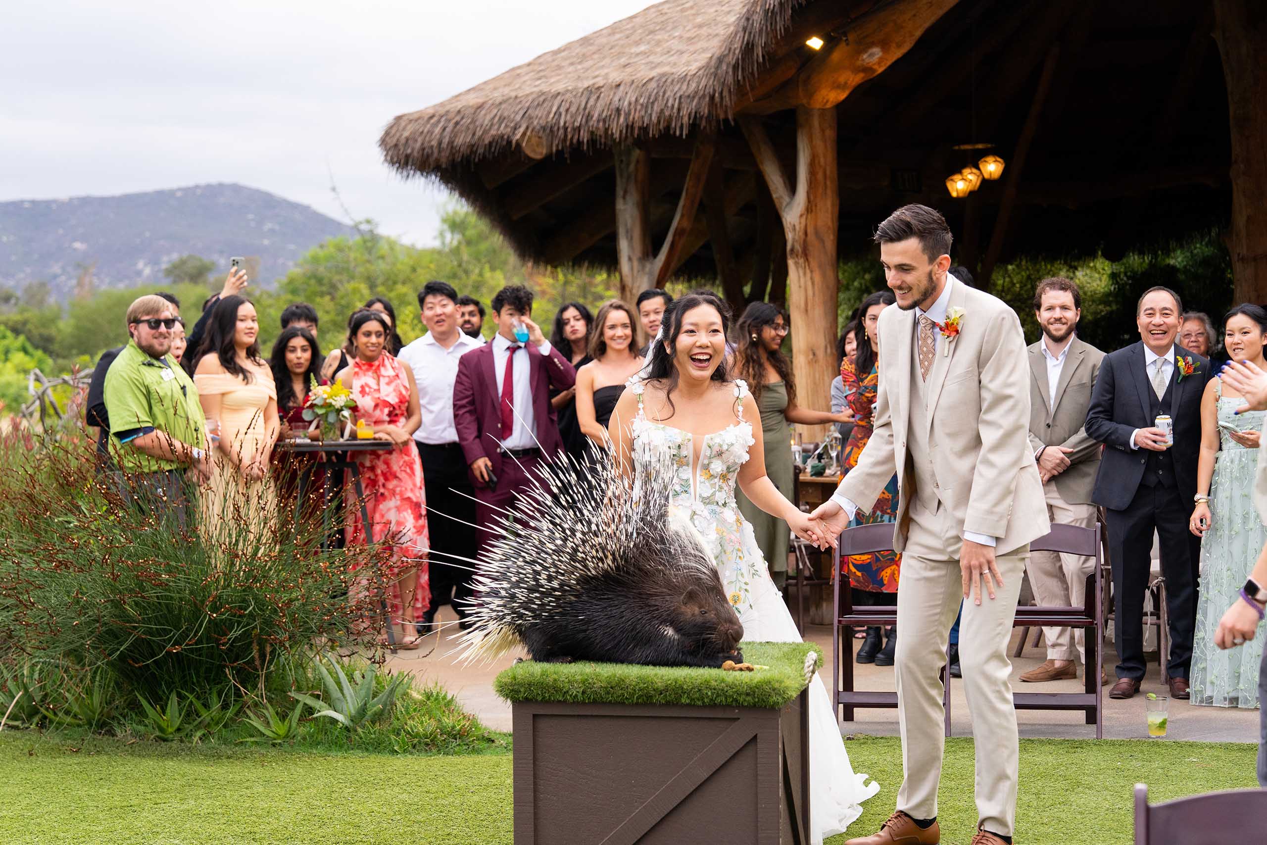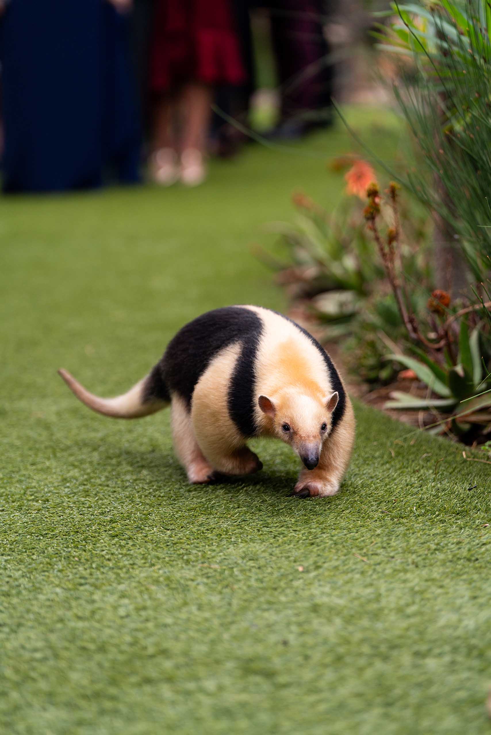 During cocktail hour, guests enjoyed African curry spiced samosas, coconut shrimp, chicken empanadas with chimichurri, and caprese skewers, alongside signature cocktails named the Maui-rita and Einstein’s Paw=jito, which honored the couple’s beloved dogs. Guests met animal ambassadors including porcupines, a sloth, an echidna, sugar gliders, a coati, and a tamandua. Dinner followed with a buffet of braised beef short ribs, cast iron seared mahi mahi, and mushroom gnocchi with rice pilaf and cheesy au gratin potatoes.