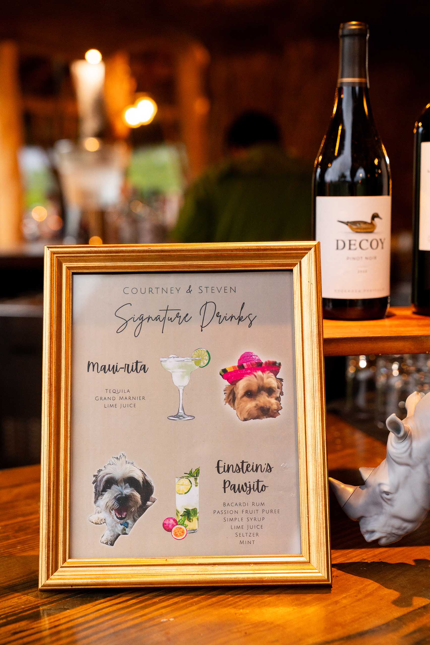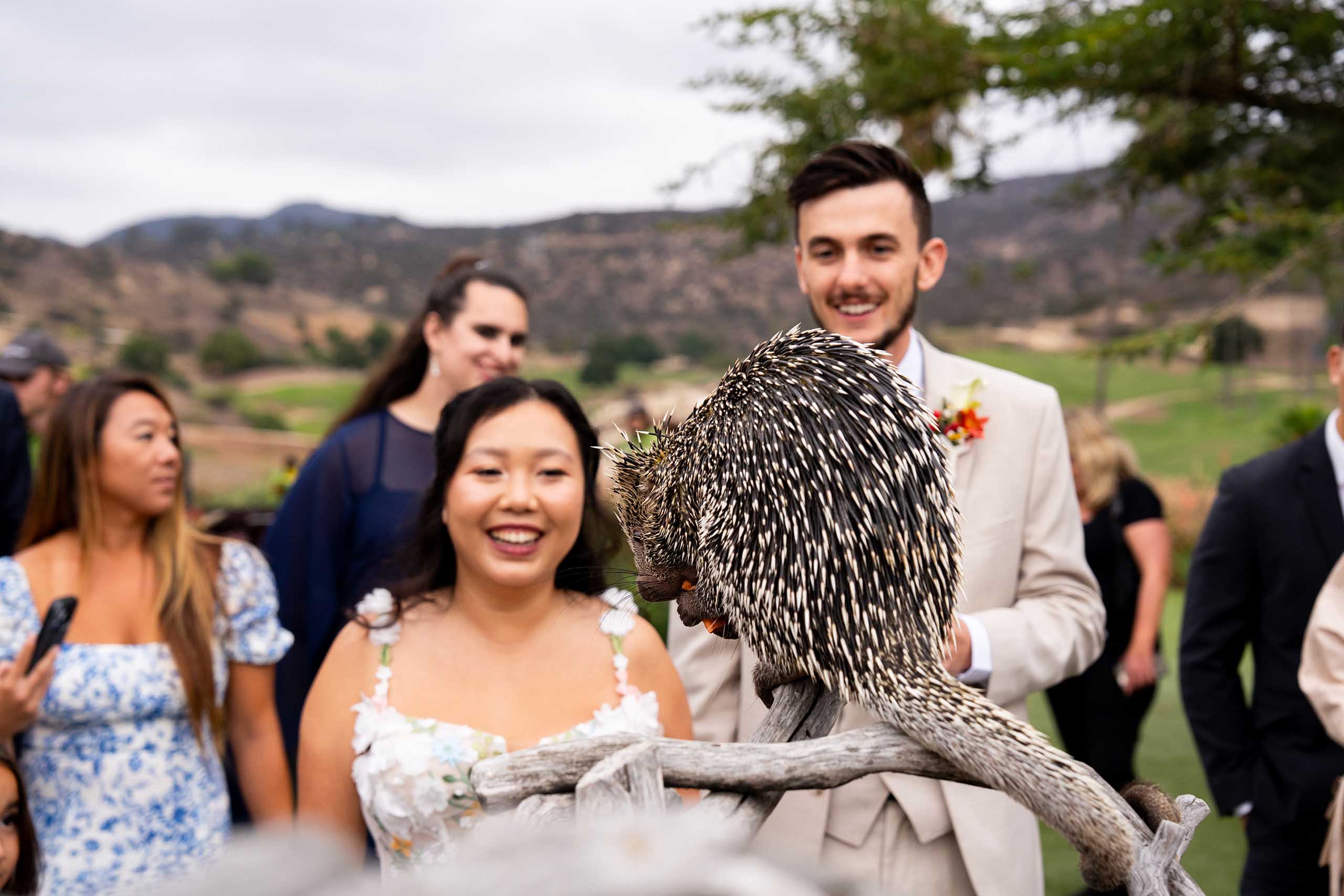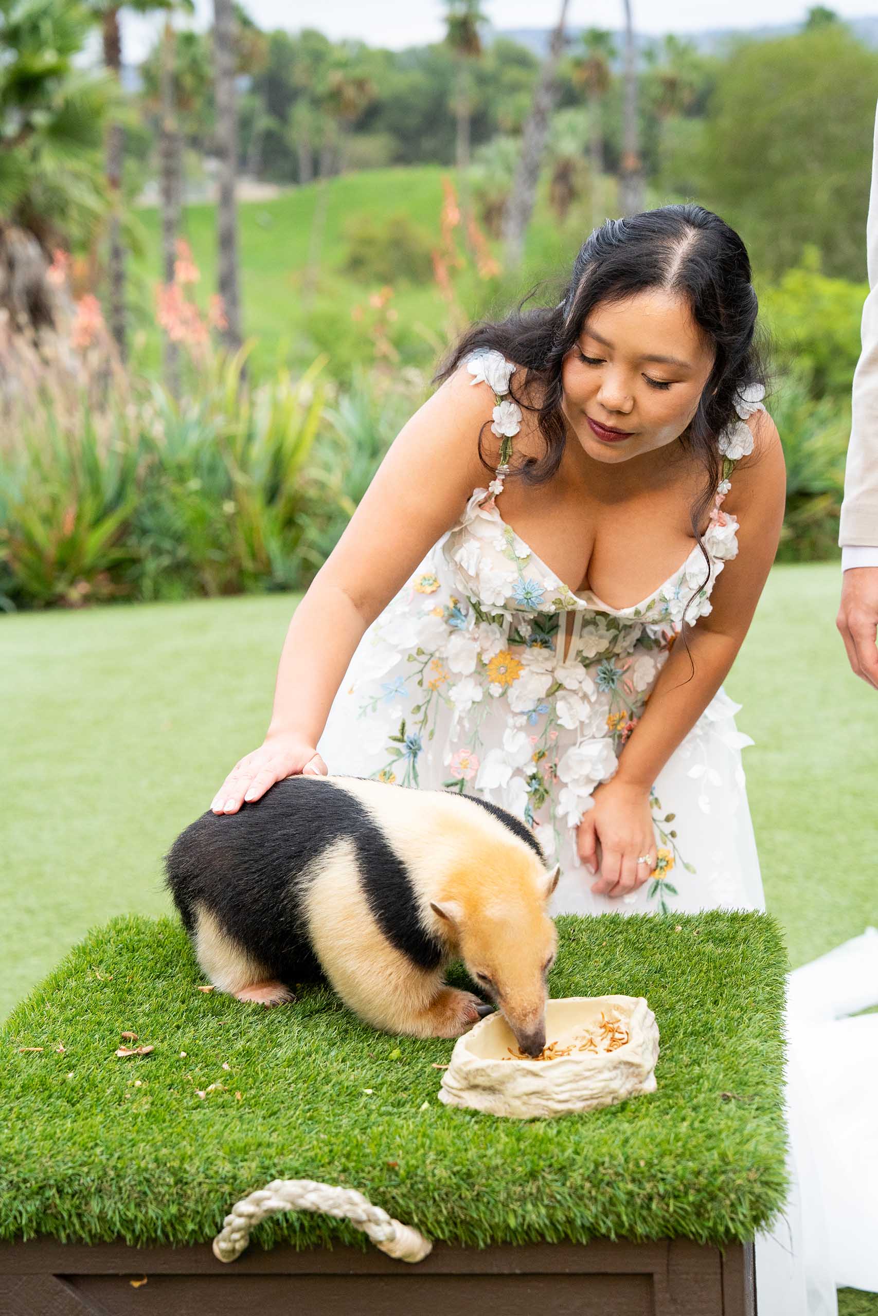 During cocktail hour, guests enjoyed African curry spiced samosas, coconut shrimp, chicken empanadas with chimichurri, and caprese skewers, alongside signature cocktails named the Maui-rita and Einstein’s Paw=jito, which honored the couple’s beloved dogs. Guests met animal ambassadors including porcupines, a sloth, an echidna, sugar gliders, a coati, and a tamandua. Dinner followed with a buffet of braised beef short ribs, cast iron seared mahi mahi, and mushroom gnocchi with rice pilaf and cheesy au gratin potatoes.