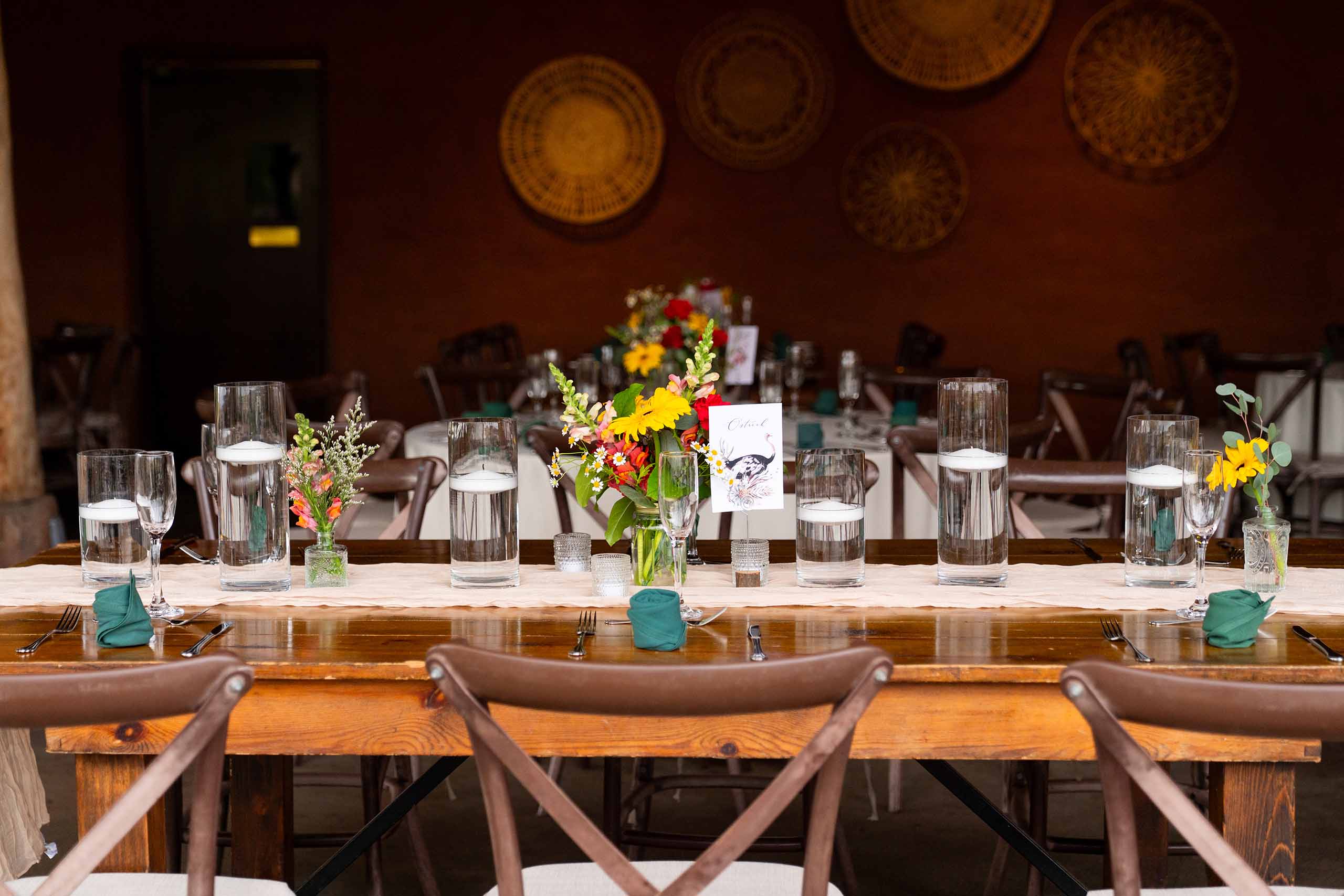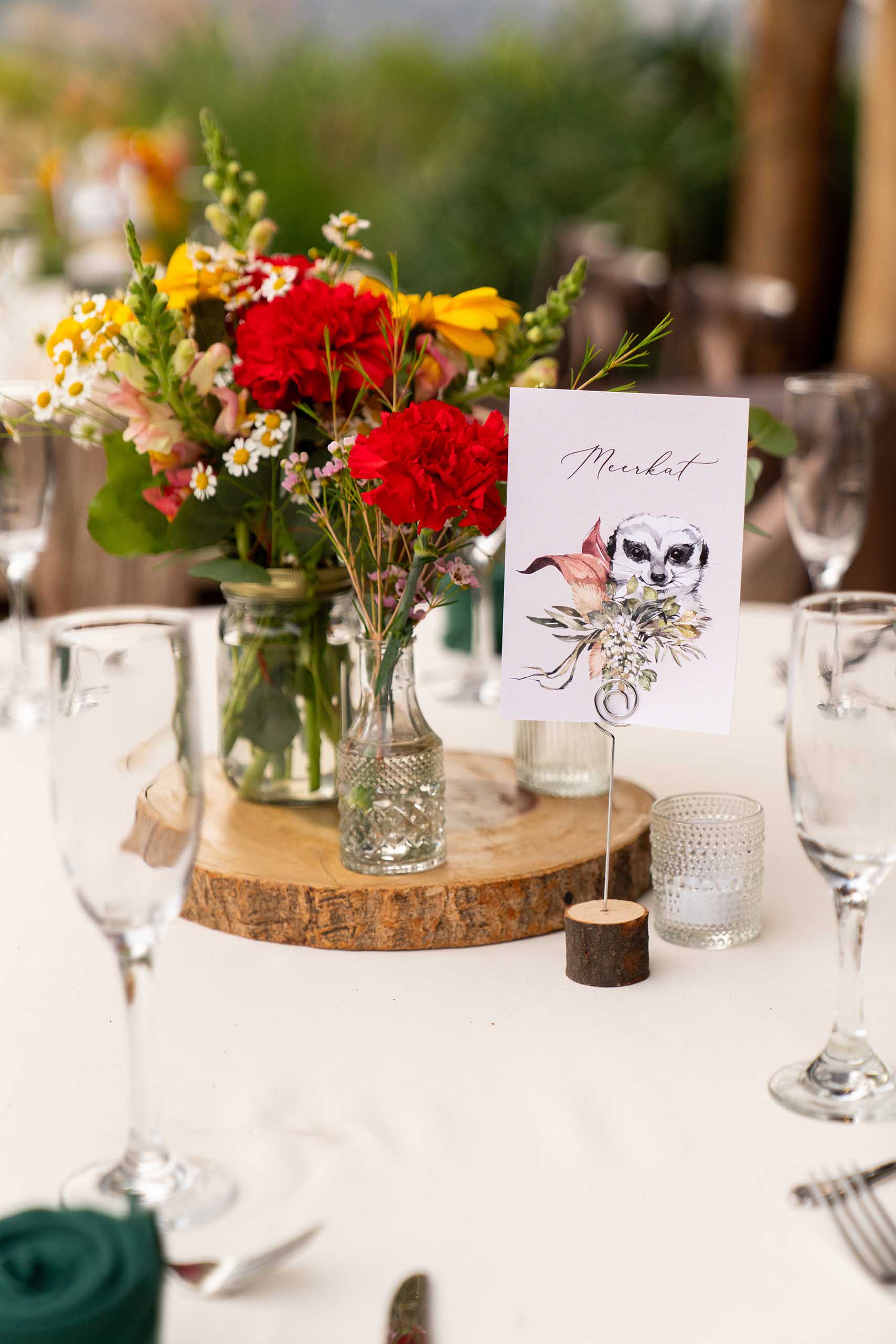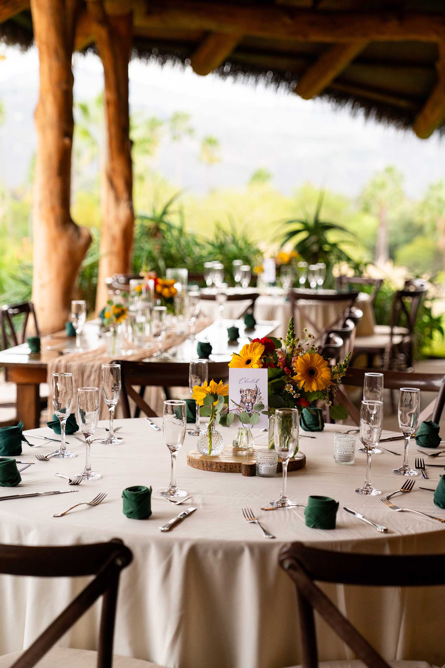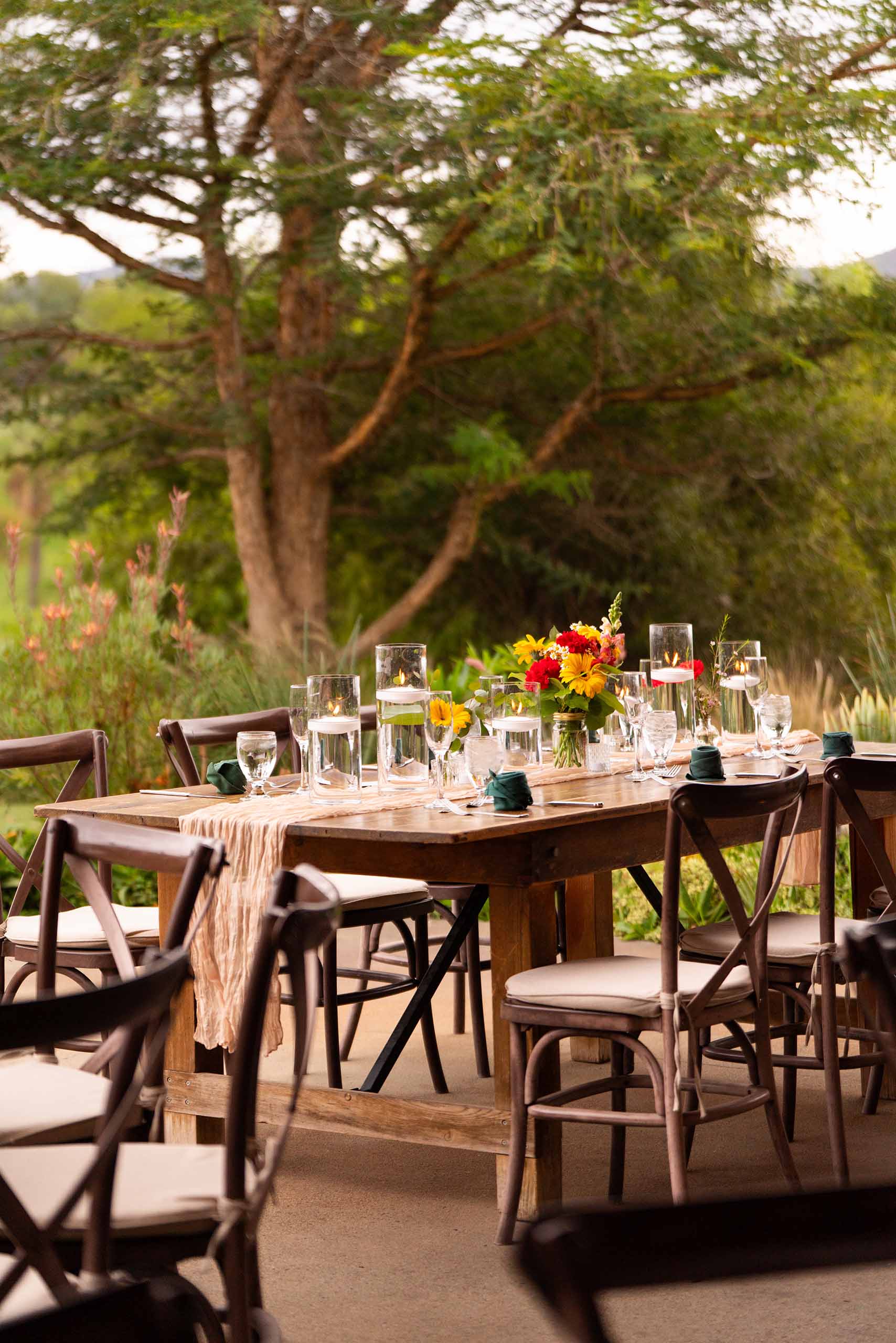 The couple kept decor intentionally simple, allowing the dramatic landscape to shine. Animal-inspired table cards and natural textures carried the safari theme throughout the reception. Florals from the ceremony arch were later moved to the couple’s sweetheart table, and guest tables were styled with petite vases of colorful blooms. Round tables featured crisp white linens with rustic wood slices beneath the flowers and floating candles in cylindrical vases, while rectangular tables showcased natural wood with cream runners, florals, and candlelight.