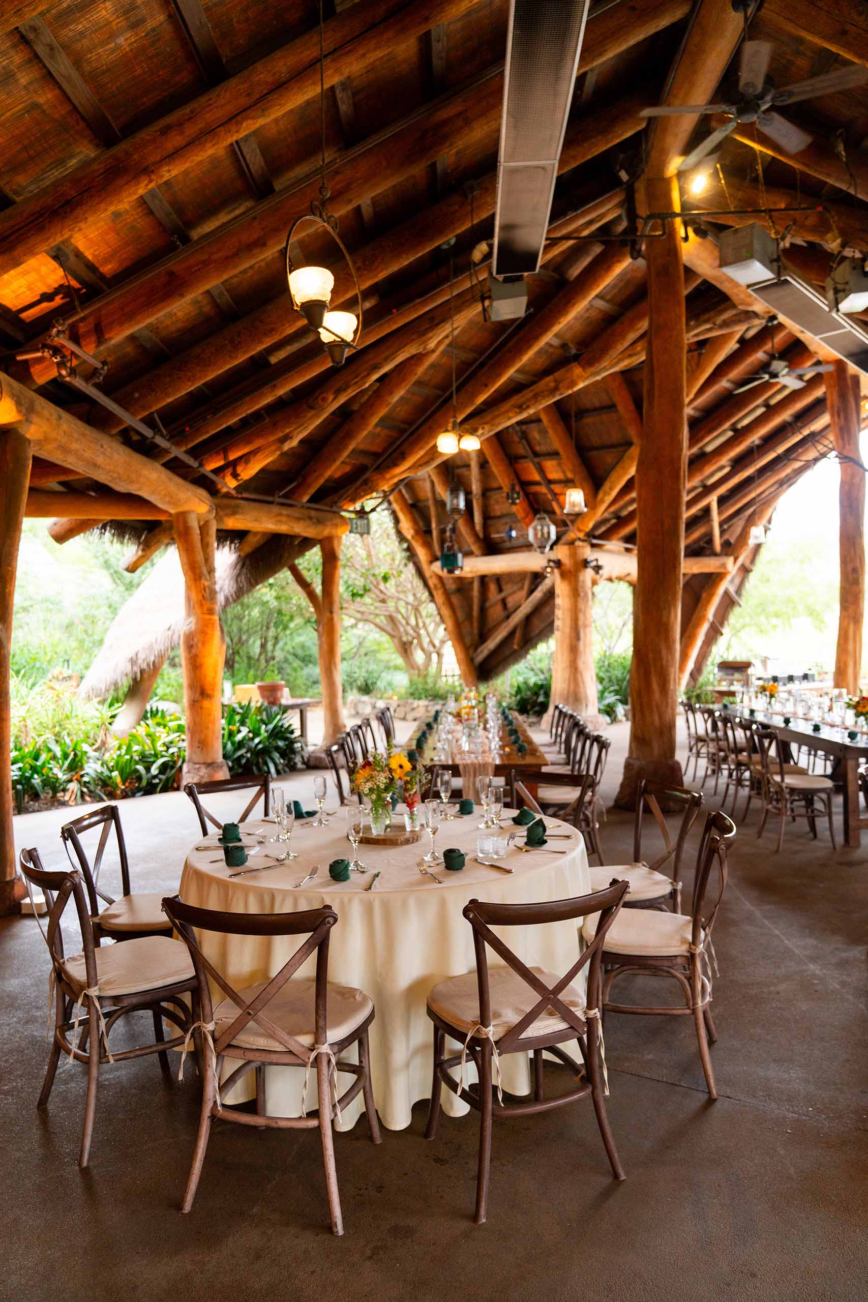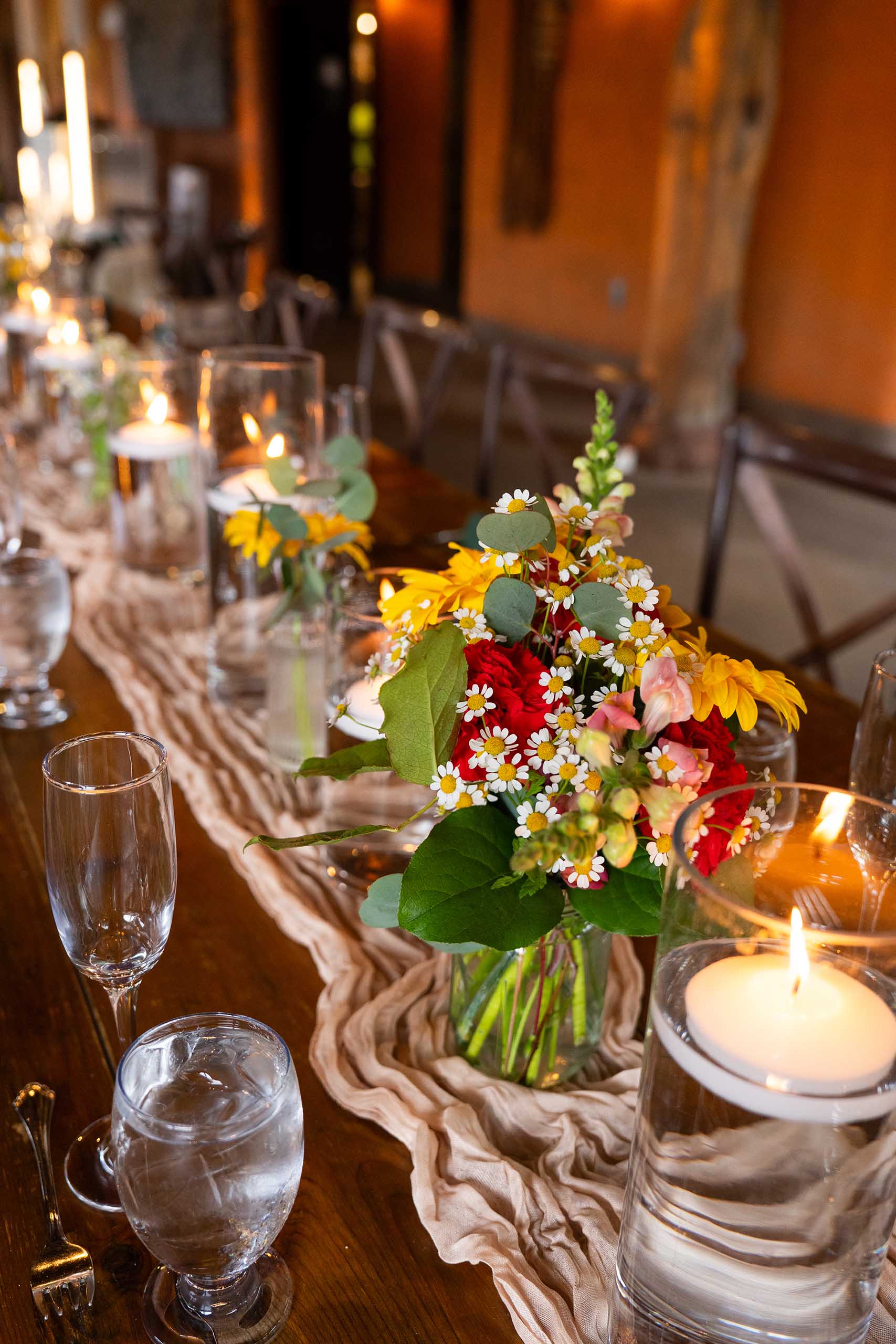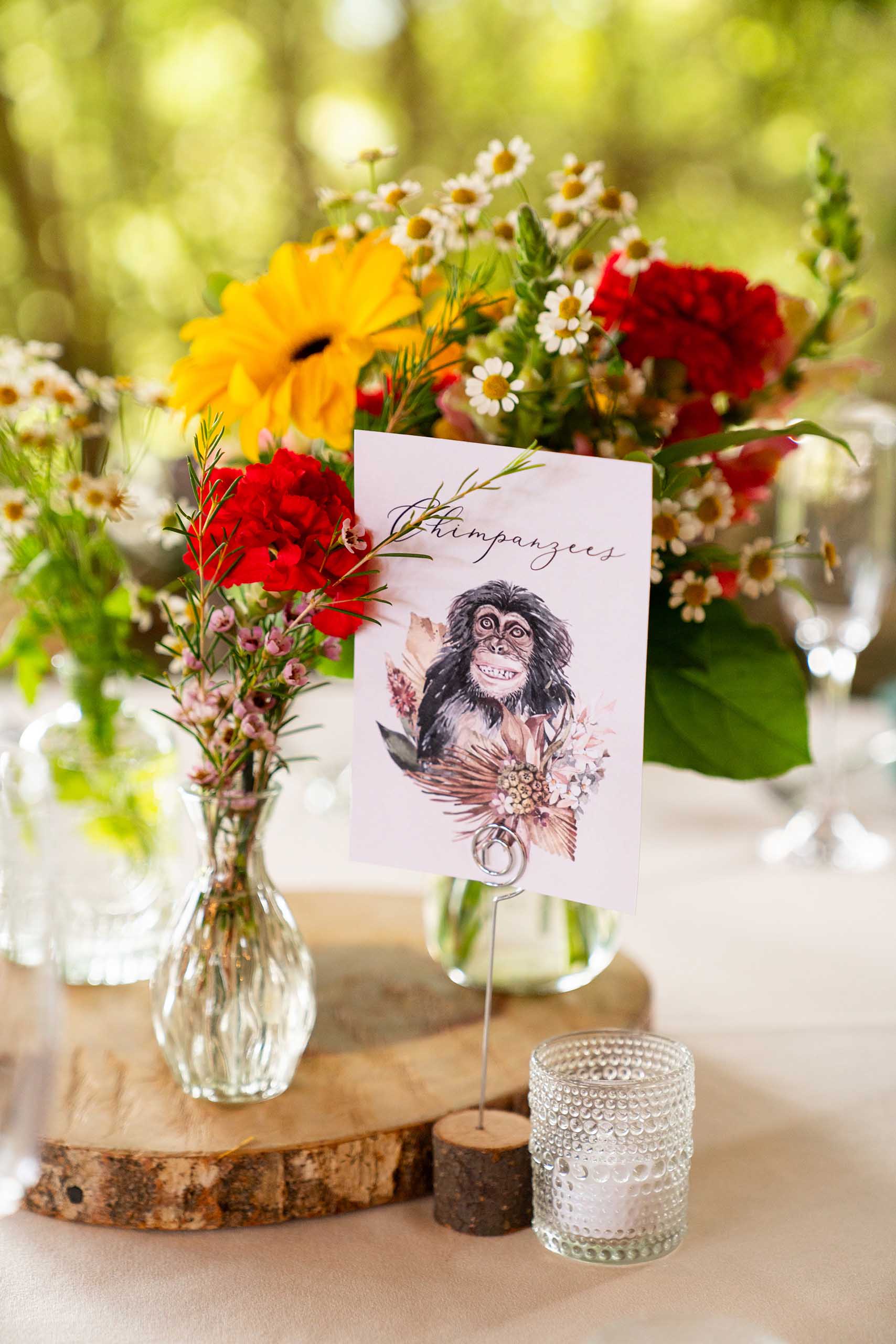 The couple kept decor intentionally simple, allowing the dramatic landscape to shine. Animal-inspired table cards and natural textures carried the safari theme throughout the reception. Florals from the ceremony arch were later moved to the couple’s sweetheart table, and guest tables were styled with petite vases of colorful blooms. Round tables featured crisp white linens with rustic wood slices beneath the flowers and floating candles in cylindrical vases, while rectangular tables showcased natural wood with cream runners, florals, and candlelight.