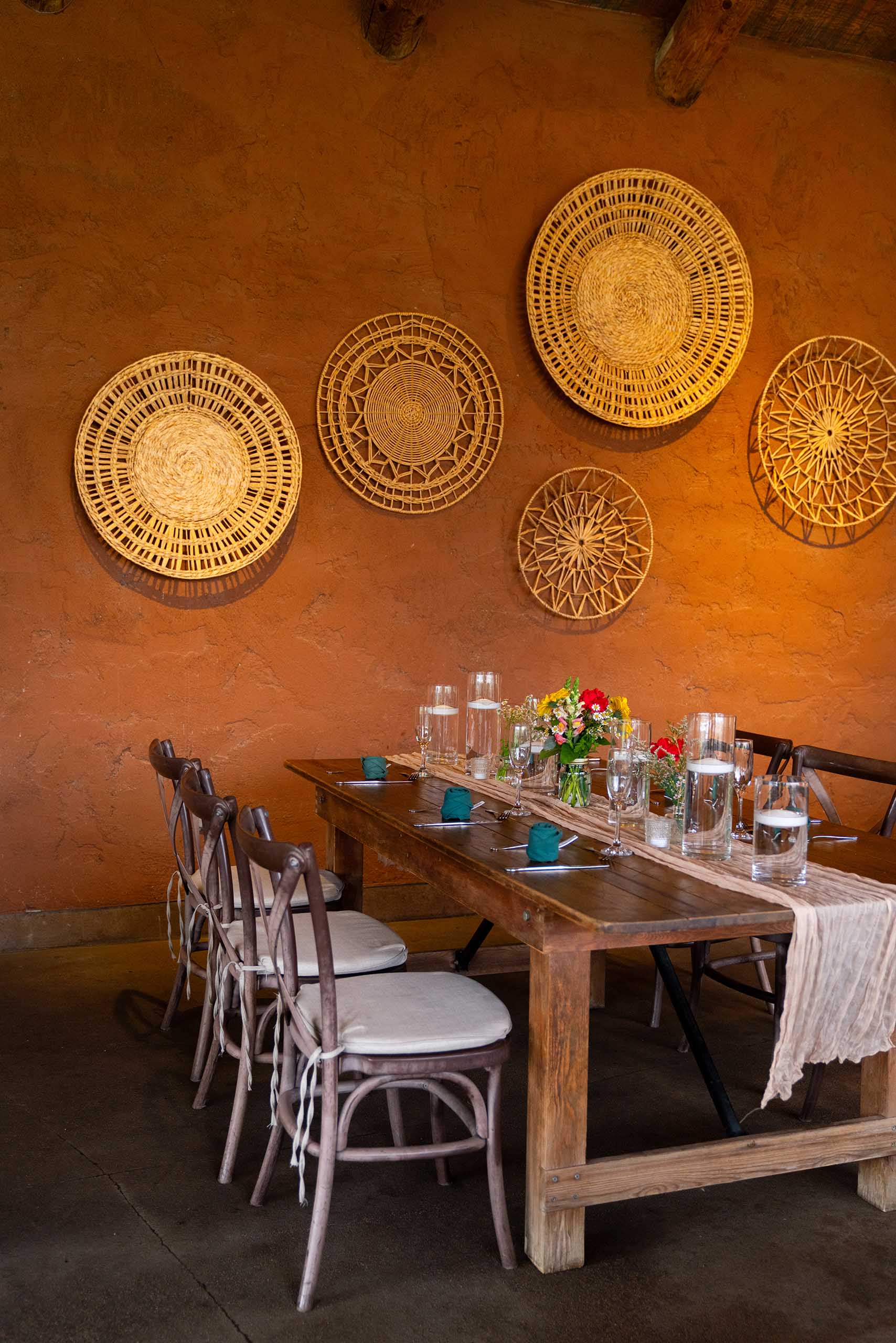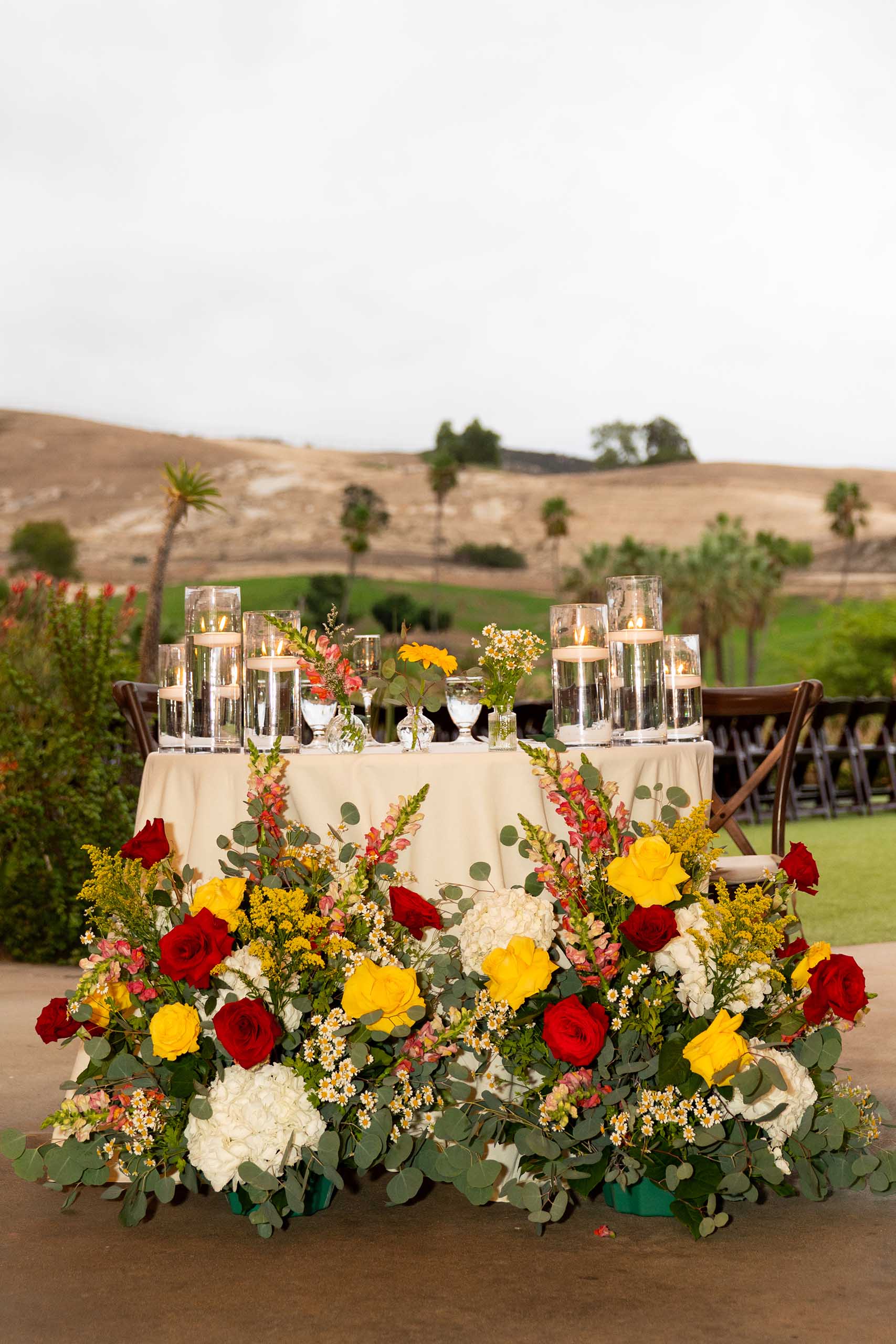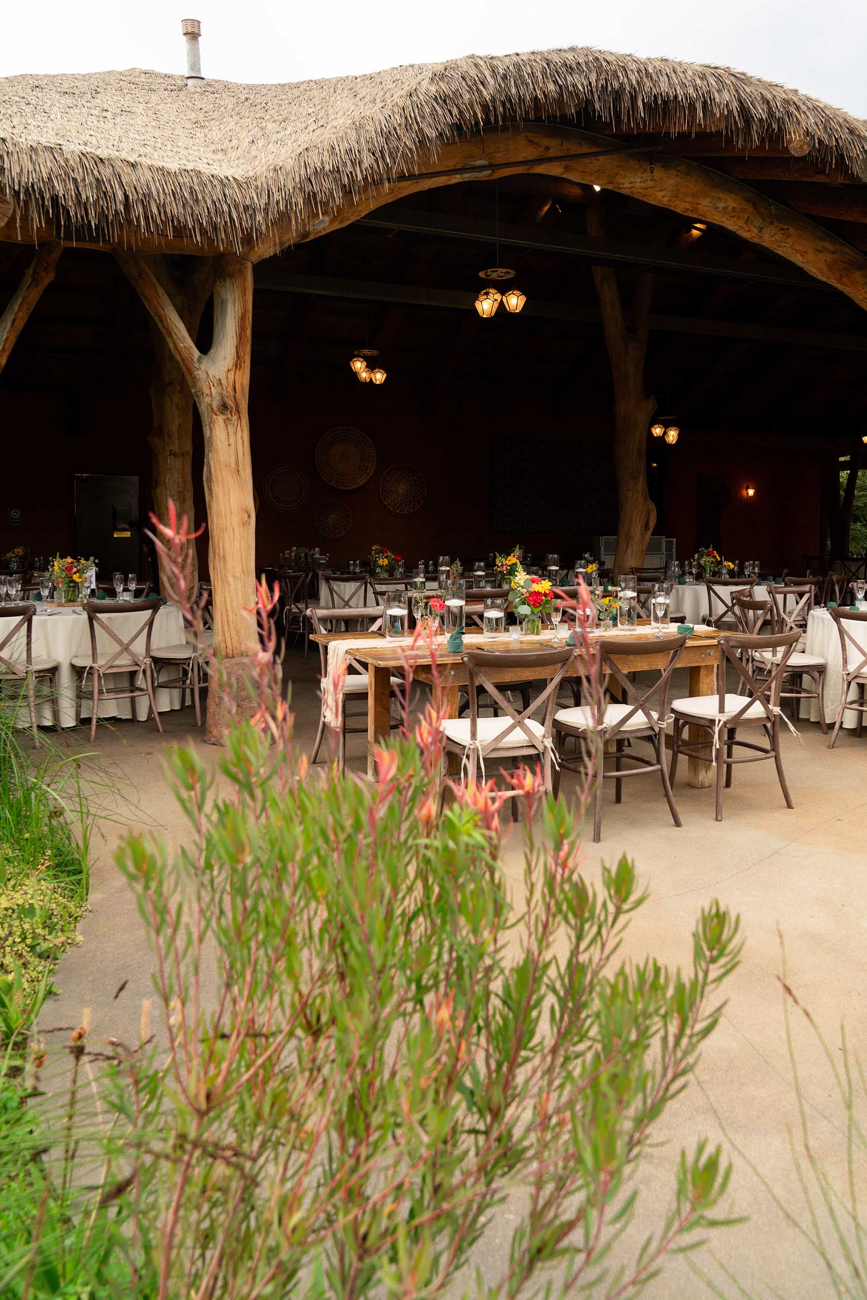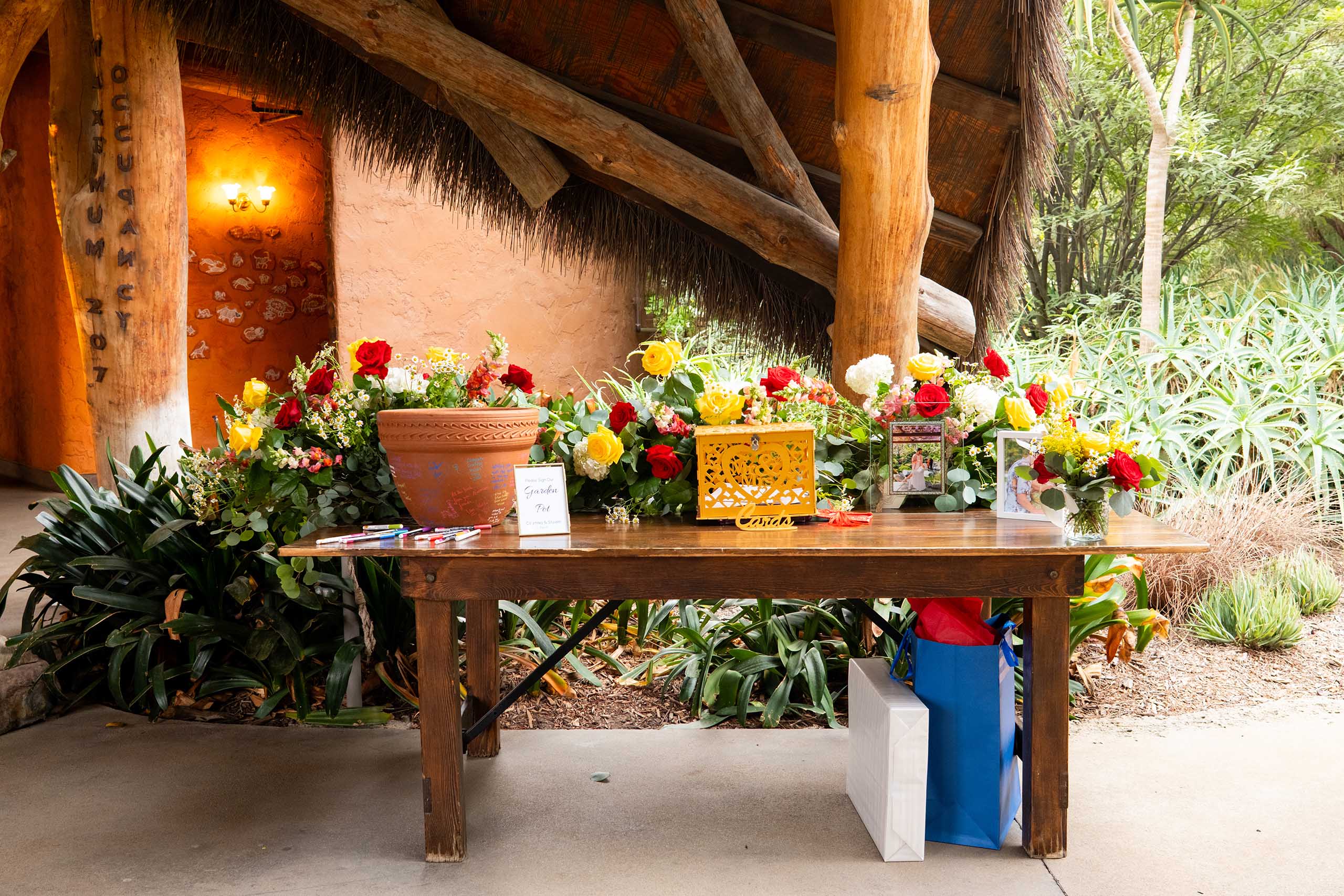 The couple kept decor intentionally simple, allowing the dramatic landscape to shine. Animal-inspired table cards and natural textures carried the safari theme throughout the reception. Florals from the ceremony arch were later moved to the couple’s sweetheart table, and guest tables were styled with petite vases of colorful blooms. Round tables featured crisp white linens with rustic wood slices beneath the flowers and floating candles in cylindrical vases, while rectangular tables showcased natural wood with cream runners, florals, and candlelight.